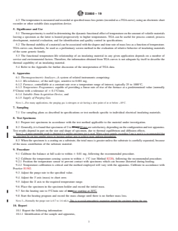 ASTM D3850-19 is a standard published by ASTM International. Its full title is "Standard Test Method for Rapid Thermal Degradation of Solid Electrical Insulating Materials By Thermogravimetric Method (TGA)". This standard covers: SIGNIFICANCE AND USE 5.1 Thermogravimetry is useful in determining the dynamic functional effect of temperature on the amount of volatile materials leaving a specimen as the latter is heated progressively to higher temperatures. TGA can be useful for process control, process development, material evaluation, and for identification and quality control in specifications. 5.2 The thermal stability of a material can be associated with the degree and time rate of mass loss as a function of temperature. TGA curves can, therefore, be used as a preliminary screen method in the evaluation of relative behavior of insulating materials of the same generic family. 5.3 The functional temperature-life relationship of an insulating material in any given application depends on a number of service and environmental factors. Therefore, the information obtained from TGA curves is not adequate by itself to describe the thermal capability of an insulating material. 5.4 Refer to the Appendix for further discussion of the interpretation of TGA data. SCOPE 1.1 This test method outlines a procedure for obtaining thermogravimetric (TGA) data on solid polymeric materials intended for use as electrical insulating materials. 1.2 Do not use this standard to quantify an estimate of the long-term thermal capability for any electrical insulating material. If a relationship exists between TGA and the long-term thermal capabilities of a material, then that fact must be established and made public, preferably by comparing data between a candidate and another material known to display similar failure modes. 1.3 The values stated in SI units are the standard. 1.4 This standard does not purport to address all of the safety concerns, if any, associated with its use. It is the responsibility of the user of this standard to establish appropriate safety, health, and environmental practices and determine the applicability of regulatory limitations prior to use. 1.5 This international standard was developed in accordance with internationally recognized principles on standardization established in the Decision on Principles for the Development of International Standards, Guides and Recommendations issued by the World Trade Organization Technical Barriers to Trade (TBT) Committee.