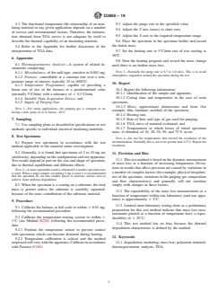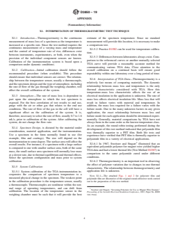 SIGNIFICANCE AND USE 5.1 Thermogravimetry is useful in determining the dynamic functional effect of temperature on the amount of volatile materials leaving a specimen as the latter is heated progressively to higher temperatures. TGA can be useful for process control, process development, material evaluation, and for identification and quality control in specifications. 5.2 The thermal stability of a material can be associated with the degree and time rate of mass loss as a function of temperature. TGA curves can, therefore, be used as a preliminary screen method in the evaluation of relative behavior of insulating materials of the same generic family. 5.3 The functional temperature-life relationship of an insulating material in any given application depends on a number of service and environmental factors. Therefore, the information obtained from TGA curves is not adequate by itself to describe the thermal capability of an insulating material. 5.4 Refer to the Appendix for further discussion of the interpretation of TGA data. SCOPE 1.1 This test method outlines a procedure for obtaining thermogravimetric (TGA) data on solid polymeric materials intended for use as electrical insulating materials. 1.2 Do not use this standard to quantify an estimate of the long-term thermal capability for any electrical insulating material. If a relationship exists between TGA and the long-term thermal capabilities of a material, then that fact must be established and made public, preferably by comparing data between a candidate and another material known to display similar failure modes. 1.3 The values stated in SI units are the standard. 1.4 This standard does not purport to address all of the safety concerns, if any, associated with its use. It is the responsibility of the user of this standard to establish appropriate safety, health, and environmental practices and determine the applicability of regulatory limitations prior to use. 1.5 This international standard was developed in accordance with internationally recognized principles on standardization established in the Decision on Principles for the Development of International Standards, Guides and Recommendations issued by the World Trade Organization Technical Barriers to Trade (TBT) Committee.