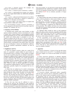 SIGNIFICANCE AND USE 5.1 This test method is meant to allow for a rapid (24 h) index of a geomedia's sorption affinity for given solutes in environmental waters or leachates. A large number of samples may be run in parallel using this test method to determine a comparative ranking of those samples, based upon the amount of solute sorbed by the geomedia, or by various geomedia or leachate constituents. The 24 h time is used to make the test convenient and also to minimize microbial, light, or hydrolytic degradation which may be a problem in longer timed procedures. While Kd values are directly applicable for screening and comparative ranking purposes, their use in predictive field applications generally requires the assumption that Kd be a fixed value. 5.2 While this test method may be useful in determining 24 h Kd values for nonvolatile organic constituents, interlaboratory testing has been carried out only for the nonvolatile inorganic species arsenic and cadmium (see Section 12). However, the procedure has been tested for single-laboratory precision with polychlorinated biphenyls (PCBs) and is believed to be useful for all stable and nonvolatile inorganic and organic constituents. This test method is not considered appropriate for volatile constituents. 5.3 The 24 h time limit may be sufficient to reach a steady-state Kd; however, the calculated Kd value should be considered a non-equilibrium measurement unless steady-state has been determined. To report this determination as a steady-state Kd, this test method should be conducted for intermediate times (for example, 12, 18, and 22 h) to ensure that the soluble concentrations in the solution have reached a steady state by 24 h. If a test duration of greater than 24 h is required, refer to Test Method D4319 for an alternate procedure of longer duration. SCOPE 1.1 This test method describes a procedure for determining the sorption affinity of waste solutes by unconsolidated geologic material in aqueous suspension. The waste solute may be derived from a variety of sources such as wells, underdrain systems, or laboratory solutions such as those produced by waste extraction tests like the Practice D3987 shake extraction method. 1.2 This test method is applicable in screening and providing relative rankings of a large number of geomedia samples for their sorption affinity in aqueous leachate/geomedia suspensions. This test method may not simulate sorption characteristics that would occur in unperturbed geologic settings. 1.3 While this procedure may be applicable to both organic and inorganic constituents, care must be taken with respect to the stability of the particular constituents and their possible losses from solution by such processes as degradation by microbes, light, hydrolysis, or sorption to material surfaces. This test method should not be used for volatile chemical constituents (see 6.1). 1.4 The values stated in SI units are to be regarded as standard. No other units of measurement are included in this standard. 1.5 This standard does not purport to address all of the safety concerns, if any, associated with its use. It is the responsibility of the user of this standard to establish appropriate safety, health, and environmental practices and determine the applicability of regulatory limitations prior to use. 1.6 This international standard was developed in accordance with internationally recognized principles on standardization established in the Decision on Principles for the Development of International Standards, Guides and Recommendations issued by the World Trade Organization Technical Barriers to Trade (TBT) Committee.