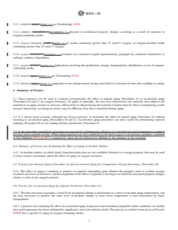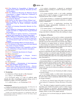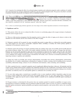 SIGNIFICANCE AND USE 5.1 This practice allows the user to evaluate the effect of service or accelerating aging on the oxygen resistance of polymeric materials used in oxygen service. 5.2 The use of this practice presupposes that the properties used to evaluate the effect of aging can be shown to relate to the intended use of the material, and are also sensitive to the effect of aging. 5.3 Polymeric materials will, in general, be more susceptible than metals to aging effects as evidenced by irreversible property loss. Such property loss may lead to catastrophic component failure, including a secondary fire, before primary ignition or combustion of the polymeric material occurs. 5.4 Polymers aged in the presence of oxygen-containing media may undergo many types of reversible and irreversible physical and chemical property change. The severity of the aging conditions determines the extent and type of changes that take place. Polymers are not necessarily degraded by aging, but may be unchanged or improved. For example, aging may drive off volatile materials, thus raising the ignition temperature without compromising mechanical properties. However, aging under prolonged or severe conditions (for example, elevated oxygen concentration) will usually cause a decrease in mechanical performance, while improving resistance to ignition and combustion. 5.5 Aging may result in reversible mass increase (physisorption), irreversible mass increase (chemisorption), plasticization, discoloration, loss of volatiles, embrittlement, softening due to sorption of volatiles, cracking, relief of molding stresses, increased crystallinity, dimensional change, advance of cure in thermosets and elastomers, chain scissioning, and crosslinking. 5.6 After a period of service, a material’s properties may be significantly different from those when new. All materials rated for oxygen service should remain resistant to ignition and combustion (primary fire risk). Furthermore, all materials rated for oxygen s... SCOPE 1.1 These practices describe procedures that are used to determine the age resistance of plastic, thermosetting, elastomeric, and polymer matrix composite materials exposed to oxygen-containing media. 1.2 While these practices focus on evaluating the age resistance of polymeric materials in oxygen-containing media prior to ignition and combustion testing, they also have relevance for evaluating the age resistance of metals, and nonmetallic oils and greases. 1.3 These practices address both established procedures that have a foundation of experience and new procedures that have yet to be validated. The latter are included to promote research and later elaboration in this practice as methods of the former type. 1.4 The results of these practices may not give exact correlation with service performance since service conditions vary widely and may involve multiple factors such as those listed in 5.8. 1.5 Three procedures are described for evaluating the age resistance of polymeric materials depending on application and information sought. 1.5.1 Procedure A: Natural Aging—This procedure is used to simulate the effect(s) of one or more service stressors on a material’s oxygen resistance, and is suitable for evaluating materials that experience continuous or intermittent exposure to elevated temperature during service. 1.5.2 Procedure B: Accelerated Aging Comparative Oxygen Resistance—This procedure is suitable for evaluating materials that are used in ambient temperature service, or at a temperature that is otherwise lower than the aging temperature, and is useful for developing oxygen compatibility rankings on a laboratory comparison basis. 1.5.3 Procedure C: Accelerated Aging Lifetime Prediction—This procedure is used to determine the relationship between aging temperature and a fixed level of property change, thereby allowing predictions to be made about the effect of prolonged service on oxidative degra...