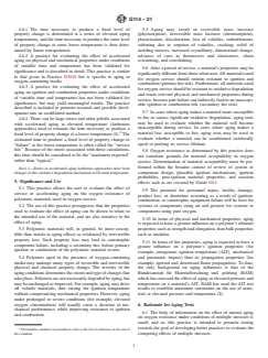 • Aging Mechanisms: The standard identifies a wide range of physical and chemical changes that may occur in polymers due to oxygen exposure, including embrittlement, cracking, discoloration, mass changes (physisorption/chemisorption), plasticization, loss of volatiles, and increased crystallinity.