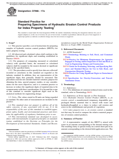 ASTM D7986-17a is a standard published by ASTM International. Its full title is "Standard Practice for Preparing Specimens of Hydraulic Erosion Control Products for Index Property Testing". This standard covers: SIGNIFICANCE AND USE 5.1 This practice is intended to simulate mixing of HECP products as would be mixed on a job or project site but in a laboratory environment on a smaller scale. Dried samples are not necessarily intended to represent a field application of HECP products but would be representative of the correct amount of material applied to a known area and provide a basis for consistent and repeatable index property testing. Note 1: The quality of the result produced by this standard is dependent on the competence of the personnel performing it, and the suitability of the equipment and facilities used. Agencies that meet the criteria of Practice D3740 are generally considered capable of competent and objective testing/sampling/inspection/etc. Users of this standard are cautioned that compliance with Practice D3740 does not in itself assure reliable results. Reliable results depend on many factors; Practice D3740 provides a means of evaluating some of those factors. SCOPE 1.1 This practice specifies a set of instructions for preparing samples of hydraulic erosion control products (HECPs) for index property testing. 1.2 All observed and calculated values shall conform to the guidelines for significant digits and rounding established in Practice D6026. 1.2.1 For purposes of comparing measured or calculated value(s) with specified limits, the measured or calculated value(s) shall be rounded to the nearest decimal or significant digits in the specified limits. 1.2.2 The procedures used to specify how data are collected/recorded or calculated, in this standard are regarded as the industry standard. In addition, they are representative of the significant digits that generally should be measured. The procedures used do not consider material variation, purpose for obtaining the data, special purpose studies, or any considerations for the users objectives; and it is common practice to increase or reduce the significant digits of reported data to be commensurate with these considerations. It is beyond the scope of this standard to consider significant digits used in the analytical methods for engineering design. 1.3 Units—The values stated in SI units are being regarded as standard. No other units of measurement are included in the practice. 1.4 This standard does not purport to address all of the safety concerns, if any, associated with its use. It is the responsibility of the user of this standard to establish appropriate safety and health practices and determine the applicability of regulatory limitations prior to use. 1.5 This international standard was developed in accordance with internationally recognized principles on standardization established in the Decision on Principles for the Development of International Standards, Guides and Recommendations issued by the World Trade Organization Technical Barriers to Trade (TBT) Committee.
