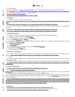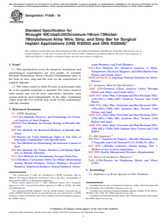 ABSTRACT This specification covers the requirements for two grades of wrought 40cobalt-20chromium-16iron-15nickel- 7molybdenum alloy in the form of wire and strip used for the manufacture of surgical implants. The heat analysis shall conform to the prescribed chemical composition requirements of grade 1 or 2. The tensile strength, hardness, yield strength, elongation, and microstructure shall be tested to meet the requirements specified. SCOPE 1.1 This specification covers the chemical, mechanical, and metallurgical requirements for two grades of wrought 40cobalt-20chromium-16iron-15nickel-7molybdenum alloy in the form of wire, strip and bar used for the manufacture of surgical implants. 1.2 The values stated in either SI units or inch-pound units are to be regarded separately as standard. The values stated in each system may not be exact equivalents; therefore, each system shall be used independently of the other. Combining values from the two systems may result in non-conformance with the standard.