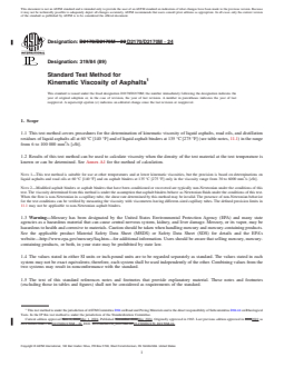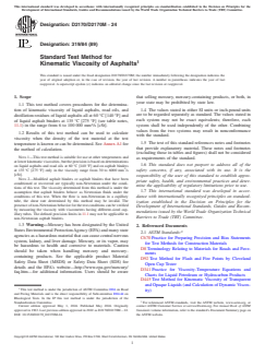 SIGNIFICANCE AND USE 5.1 The kinematic viscosity characterizes flow behavior. The method is used to determine the consistency of liquid asphalt as one element in establishing the uniformity of shipments or sources of supply. The specifications are usually at temperatures of 60 and 135 °C. Note 3: The quality of the results produced by this standard are dependent on the competence of the personnel performing the procedure and the capability, calibration, and maintenance of the equipment used. Agencies that meet the criteria of Specification D3666 are generally considered capable of competent and objective testing, sampling, inspection, etc. Users of this standard are cautioned that compliance with Specification D3666 alone does not completely ensure reliable results. Reliable results depend on many factors; following the suggestions of Specification D3666 or some similar acceptable guideline provides a means of evaluating and controlling some of those factors. SCOPE 1.1 This test method covers procedures for the determination of kinematic viscosity of liquid asphalts, road oils, and distillation residues of liquid asphalts all at 60 °C [140 °F] and of liquid asphalt binders at 135 °C [275 °F] (see table notes, 11.1) in the range from 6 to 100 000 mm2/s [cSt]. 1.2 Results of this test method can be used to calculate viscosity when the density of the test material at the test temperature is known or can be determined. See Annex A1 for the method of calculation. Note 1: This test method is suitable for use at other temperatures and at lower kinematic viscosities, but the precision is based on determinations on liquid asphalts and road oils at 60 °C [140 °F] and on asphalt binders at 135 °C [275 °F] only in the viscosity range from 30 to 6000 mm2/s [cSt]. Note 2: Modified asphalt binders or asphalt binders that have been conditioned or recovered are typically non-Newtonian under the conditions of this test. The viscosity determined from this method is under the assumption that asphalt binders behave as Newtonian fluids under the conditions of this test. When the flow is non-Newtonian in a capillary tube, the shear rate determined by this method may be invalid. The presence of non-Newtonian behavior for the test conditions can be verified by measuring the viscosity with viscometers having different-sized capillary tubes. The defined precision limits in 11.1 may not be applicable to non-Newtonian asphalt binders. 1.3 Warning—Mercury has been designated by the United States Environmental Protection Agency (EPA) and many state agencies as a hazardous material that can cause central nervous system, kidney, and liver damage. Mercury, or its vapor, may be hazardous to health and corrosive to materials. Caution should be taken when handling mercury and mercury-containing products. See the applicable product Material Safety Data Sheet (MSDS) or Safety Data Sheet (SDS) for details and the EPA’s website—http://www.epa.gov/mercury/faq.htm—for additional information. Users should be aware that selling mercury, mercury-containing products, or both, in your state may be prohibited by state law. 1.4 The values stated in either SI units or inch-pound units are to be regarded separately as standard. The values stated in each system may not be exact equivalents; therefore, each system shall be used independently of the other. Combining values from the two systems may result in nonconformance with the standard. 1.5 The text of this standard references notes and footnotes that provide explanatory material. These notes and footnotes (excluding those in tables and figures) shall not be considered as requirements of the standard. 1.6 This standard does not purport to address all of the safety concerns, if any, associated with its use. It is the responsibility of the user of this standard to establish appropriate safety, health, and environmental practices and determine the applicability of regulatory limitations prior ...