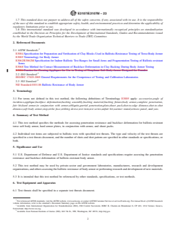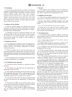 SIGNIFICANCE AND USE 5.1 U.S. Department of Defense and U.S. Department of Justice standards and specifications require assessing the penetration resistance and backface deformation of ballistic-resistant body armor. 5.2 This test method may be used by private-sector and government laboratories, manufacturers, research and development organizations, and others assessing the ballistic resistance of body armor or performing research and development of new materials. 5.3 It is intended that this test method be referenced by other standards, specifications, or test methods. SCOPE 1.1 This test method addresses resistance to ballistic penetration and to backface deformation (BFD) for ballistic-resistant torso body armor and shoot packs. 1.2 This test method is intended for testing of soft body armor, hard armor plates, in conjunction with armor, and shoot packs mounted on a clay block as the backing assembly. Note 1: This test method does not apply to ballistic helmets, inserts, trauma packs, trauma plates, or accessories. 1.3 The test method does not specify performance criteria or usage of the test results. 1.4 This test method does not address conditioning of test items. 1.5 It is anticipated that this test method will be referenced by certifiers, purchasers, or other users in order to meet their specific needs. 1.5.1 Purchasers and other users will specify the ballistic test threats to be used. Within this test method, the reference defining the ballistic test threats is called the “test threats document.” 1.5.2 In this test method, “other standards and specifications” and “unless specified elsewhere” refer to documents (for example, military standards, purchase specifications) that require the use of this test method. Purchasers and other users are responsible for the “other standards and specifications” and for specifying any requirements that supersede those of this test method. 1.6 Units—The values stated in either SI units or inch-pound units are to be regarded separately as standard. The values stated in each system are not necessarily exact equivalents; therefore, to ensure conformance with the standard, each system shall be used independently of the other, and values from the two systems shall not be combined. 1.6.1 The user of this standard will identify the system of units to be used, and it is critical to ensure that any cross-referenced standards maintain consistency of units between standards. 1.7 This standard does not purport to address all of the safety concerns, if any, associated with its use. It is the responsibility of the user of this standard to establish appropriate safety, health, and environmental practices and determine the applicability of regulatory limitations prior to use. 1.8 This international standard was developed in accordance with internationally recognized principles on standardization established in the Decision on Principles for the Development of International Standards, Guides and Recommendations issued by the World Trade Organization Technical Barriers to Trade (TBT) Committee.