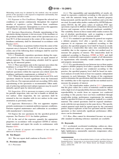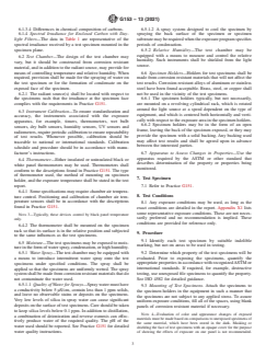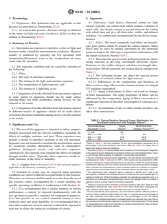 ASTM G153-13(2021) is a standard published by ASTM International. Its full title is "Standard Practice for Operating Enclosed Carbon Arc Light Apparatus for Exposure of Nonmetallic Materials". This standard covers: SIGNIFICANCE AND USE 5.1 The use of this apparatus is intended to induce property changes associated with the end use conditions, including the effects of sunlight, moisture, and heat. These exposures may include a means to introduce moisture to the test specimen. Exposures are not intended to simulate the deterioration caused by localized weather phenomena, such as atmospheric pollution, biological attack, and saltwater exposure. Alternatively, the exposure may simulate the effects of sunlight through window glass. Typically, these exposures would include moisture in the form of humidity. Note 2: Caution: Refer to Practice G151 for full cautionary guidance applicable to all laboratory weathering devices. 5.2 Variation in results may be expected when operating conditions are varied within the accepted limits of this practice. Therefore, no reference shall be made to results from the use of this practice unless accompanied by a report detailing the specific operating conditions in conformance with Section 10. 5.2.1 It is recommended that a similar material of known performance, a control, be exposed simultaneously with the test specimen to provide a standard for comparative purposes. It is best practice to use control materials known to have relatively poor and good durability. It is recommended that at least three replicates of each material evaluated be exposed in each test to allow for statistical evaluation of results. SCOPE 1.1 This practice covers the basic principles and operating procedures for using enclosed carbon-arc light and water apparatus intended to reproduce the weathering effects that occur when materials are exposed to sunlight (either direct or through window glass) and moisture as rain or dew in actual use. This practice is limited to the procedures for obtaining, measuring, and controlling conditions of exposure. A number of exposure procedures are listed in an appendix; however, this practice does not specify the exposure conditions best suited for the material to be tested. Note 1: Practice G151 describes performance criteria for all exposure devices that use laboratory light sources. This practice replaces Practice G23, which describes very specific designs for devices used for carbon-arc exposures. The apparatus described in Practice G23 is covered by this practice. 1.2 Test specimens are exposed to enclosed carbon arc light under controlled environmental conditions. 1.3 Specimen preparation and evaluation of the results are covered in various methods or specifications for specific materials. General guidance is given in Practice G151 and ISO 4892-1. More specific information about methods for determining the change in properties after exposure and reporting these results is described in ISO 4582. 1.4 The values stated in SI units are to be regarded as the standard. 1.5 This standard does not purport to address all of the safety concerns, if any, associated with its use. It is the responsibility of the user of this standard to establish appropriate safety, health, and environmental practices and determine the applicability of regulatory limitations prior to use. 1.5.1 Should any ozone be generated from the operation of the light source, it shall be carried away from the test specimens and operating personnel by an exhaust system. 1.6 This international standard was developed in accordance with internationally recognized principles on standardization established in the Decision on Principles for the Development of International Standards, Guides and Recommendations issued by the World Trade Organization Technical Barriers to Trade (TBT) Committee.