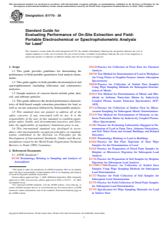 ASTM E1775-20 is a guide published by ASTM International. Its full title is "Standard Guide for Evaluating Performance of On-Site Extraction and Field-Portable Electrochemical or Spectrophotometric Analysis for Lead". This standard covers: SIGNIFICANCE AND USE 4.1 This guide is intended for use in evaluating the performance of field-portable electroanalytical or spectrophotometric devices for lead determination, or both. 4.2 Desired performance criteria for field-based extraction procedures are provided. 4.3 Performance parameters of concern may be determined using protocols that are referenced in this guide. 4.4 Example reference materials to be used in assessing the performance of field-portable lead analyzers are listed. 4.5 Exhaustive details regarding quality assurance issues are outside the scope of this guide. Applicable quality assurance aspects are dealt with extensively in references that are cited in this guide. SCOPE 1.1 This guide provides guidelines for determining the performance of field-portable quantitative lead analysis instruments. 1.2 This guide applies to field-portable electroanalytical and spectrophotometric (including reflectance and colorimetric) analyzers. 1.3 Sample matrices of concern herein include paint, dust, soil, and airborne particles. 1.4 This guide addresses the desired performance characteristics of field-based sample extraction procedures for lead, as well as on-site extraction followed by field-portable analysis. 1.5 This standard does not purport to address all of the safety concerns, if any, associated with its use. It is the responsibility of the user of this standard to establish appropriate safety, health, and environmental practices and determine the applicability of regulatory limitations prior to use. 1.6 This international standard was developed in accordance with internationally recognized principles on standardization established in the Decision on Principles for the Development of International Standards, Guides and Recommendations issued by the World Trade Organization Technical Barriers to Trade (TBT) Committee.