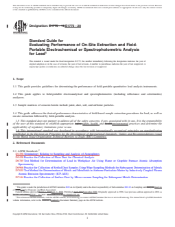 SIGNIFICANCE AND USE 4.1 This guide is intended for use in evaluating the performance of field-portable electroanalytical or spectrophotometric devices for lead determination, or both. 4.2 Desired performance criteria for field-based extraction procedures are provided. 4.3 Performance parameters of concern may be determined using protocols that are referenced in this guide. 4.4 Example reference materials to be used in assessing the performance of field-portable lead analyzers are listed. 4.5 Exhaustive details regarding quality assurance issues are outside the scope of this guide. Applicable quality assurance aspects are dealt with extensively in references that are cited in this guide. SCOPE 1.1 This guide provides guidelines for determining the performance of field-portable quantitative lead analysis instruments. 1.2 This guide applies to field-portable electroanalytical and spectrophotometric (including reflectance and colorimetric) analyzers. 1.3 Sample matrices of concern herein include paint, dust, soil, and airborne particles. 1.4 This guide addresses the desired performance characteristics of field-based sample extraction procedures for lead, as well as on-site extraction followed by field-portable analysis. 1.5 This standard does not purport to address all of the safety concerns, if any, associated with its use. It is the responsibility of the user of this standard to establish appropriate safety, health, and environmental practices and determine the applicability of regulatory limitations prior to use. 1.6 This international standard was developed in accordance with internationally recognized principles on standardization established in the Decision on Principles for the Development of International Standards, Guides and Recommendations issued by the World Trade Organization Technical Barriers to Trade (TBT) Committee.