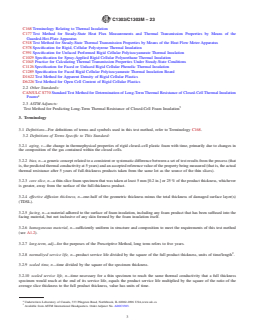 SIGNIFICANCE AND USE 5.1 Rigid gas-filled closed-cell foam insulations include all cellular plastic insulations which rely on a blowing agent (or gas), other than air, for thermal resistance values. At the time of manufacture, the cells of the foam usually contain their highest percentage of blowing agent and the lowest percentage of atmospheric gases. As time passes, the relative concentrations of these gases change due primarily to diffusion. This results in a general reduction of the thermal resistance of the foam due to an increase in the thermal conductivity of the resultant cell gas mixture. These phenomena are typically referred to as foam aging. 5.1.1 For some rigid gas-filled closed-cell foam insulation products produced using blowing agent gases that diffuse very rapidly out of the full-thickness foam product, such as expanded polystyrene, there is no need to accelerate the aging process. 5.1.2 Physical gas diffusion phenomena occur in three dimensions. The one-dimensional form of the diffusion equations used in the development of this practice are valid only for planar geometries, that is, for specimens that have parallel faces and where the thickness is much smaller than the width and much smaller than the length. Note 3: Please see Appendix X3 for a discussion of the theory of accelerated aging via thin slicing. Note 4: Theoretical and experimental evaluations of the aging of insulation in radial forms, such as pipe insulation, have been made. (6) However, these practices have not evolved to the point of inclusion in the test standard. 5.2 The change in thermal resistance due to the phenomena described in 5.1 usually occurs over an extended period of time. Information regarding changes in the thermal resistance of these materials as a function of time is required in a shorter period of time so that decisions regarding formulations, production, and comparisons with other materials can be made. 5.3 Specifications C578, C591, C1029, C1126 and C1289 on rigid cl... SCOPE 1.1 This test method covers a procedure for predicting the long-term thermal resistance (LTTR) of unfaced or permeably faced rigid gas-filled closed-cell foam insulations by reducing the specimen thickness to accelerate aging under controlled laboratory conditions (1-5) .2 Note 1: See Terminology, 3.2.1, for the meaning of the word aging within this standard. 1.2 Rigid gas-filled closed-cell foam insulation includes all cellular plastic insulations manufactured with the intent to retain a blowing agent other than air. 1.3 This test method is limited to unfaced or permeably faced, homogeneous materials. This method is applied to a wide range of rigid closed-cell foam insulation types, including but not limited to: extruded polystyrene, polyurethane, polyisocyanurate, and phenolic. This test method does not apply to impermeably faced rigid closed-cell foams or to rigid closed-cell bun stock foams. Note 2: See Note 8 for more details regarding the applicability of this test method to rigid closed-cell bun stock foams. 1.4 This test method utilizes referenced standard test procedures for measuring thermal resistance. Periodic measurements are performed on specimens to observe the effects of aging. Specimens of reduced thickness (that is, thin slices) are used to shorten the time required for these observations. The results of these measurements are used to predict the long-term thermal resistance of the material. 1.5 The test method is given in two parts. The Prescriptive Method in Part A provides long-term thermal resistance values on a consistent basis that can be used for a variety of purposes, including product evaluation, specifications, or product comparisons. The Research Method in part B provides a general relationship between thermal conductivity, age, and product thickness. 1.5.1 To use the Prescriptive Method, the date of manufacture must be known, which usually involves the cooperation of the m...