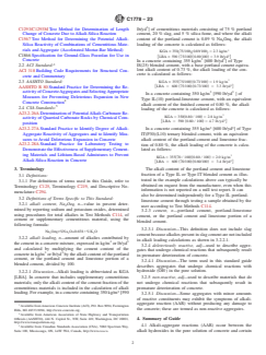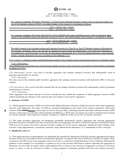 - Mitigation Strategies: The standard covers the use of supplementary cementitious materials (SCMs), blended cements, lithium-based admixtures, and limits on alkali content as potential measures to control ASR. For ACR, the primary preventive measure is the avoidance of reactive carbonate rocks.