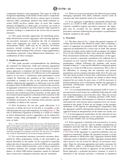 SIGNIFICANCE AND USE 5.1 This guide provides recommendations for identifying the potential for deleterious AAR and selecting appropriate preventive measures, based on a prescriptive-based or performance approach, to minimize the risk of deleterious reaction. In regions where occurrences of AAR are rare or the aggregate sources in use have a satisfactory field performance record verified by following the guidance in this standard, it is reasonable to continue to rely on the previous field history without subjecting the aggregates to laboratory tests for AAR. In regions where AAR problems have occurred or the reactivity of aggregates is known to vary from source to source, it may be necessary to follow a testing program to determine potential reactivity and evaluate preventive measures. In this guide, the level of prevention required is a function of the reactivity of the aggregate, the nature of the exposure conditions (especially availability of moisture), the criticality of the structure, and the availability of alkali in the concrete. 5.2 Risk Evaluation—To use this guide effectively, it is necessary to define the level of risk that is acceptable, as this will determine the type and complexity of testing (Note 1). The risk of deleterious expansion occurring as a result of a failure to detect deleteriously reactive aggregates can be reduced by routine testing using petrography, or laboratory expansion tests, or both. Note 1: The level of risk of alkali-silica reaction will depend upon the nature of the project (criticality of the structure and anticipated exposure). The determination of the level of risk is the responsibility of the individual in charge of the design, commonly a representative of the owner, and for structures designed in accordance with ACI 318, the level of acceptable risk would be determined by the licensed design professional. 5.3 For conventional structures, preventive measures determined by either performance testing or the prescriptive approach described ... SCOPE 1.1 This guide provides guidance on how to address the potential for deleterious alkali aggregate reaction (AAR) in concrete construction. This guide addresses the process of identifying both potentially alkali-silica reactive (ASR) and alkali-carbonate reactive (ACR) aggregates through standardized testing procedures and the selection of mitigation options to minimize the risk of expansion when ASR aggregates are used in concrete construction. Mitigation methods for ASR aggregates are selected using either prescriptive or performance-based alternatives. Preventive measures for ACR aggregates are limited to avoidance of use. Because the potential for deleterious reactions depends not only on the concrete mixture but also the in-service exposure, guidance is provided on the type of structures and exposure environments where AAR may be of concern. 1.2 Units—The values stated in either SI units or inch-pound units are to be regarded separately as standard. The values stated in each system may not be exact equivalents; therefore, each system shall be used independently of the other. Combining values from the two systems may result in nonconformance with the standard. 1.3 This standard does not purport to address all of the safety concerns, if any, associated with its use. It is the responsibility of the user of this standard to establish appropriate safety, health, and environmental practices and determine the applicability of regulatory limitations prior to use. 1.4 This international standard was developed in accordance with internationally recognized principles on standardization established in the Decision on Principles for the Development of International Standards, Guides and Recommendations issued by the World Trade Organization Technical Barriers to Trade (TBT) Committee.