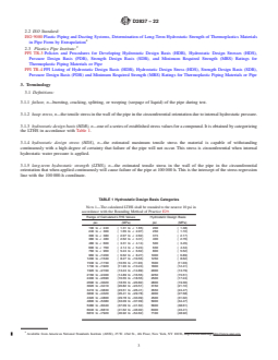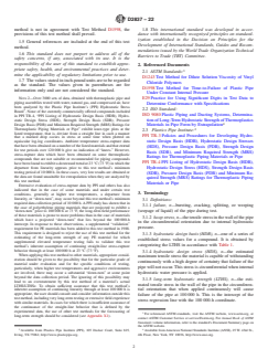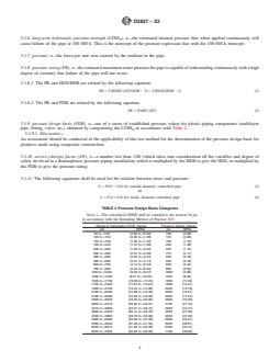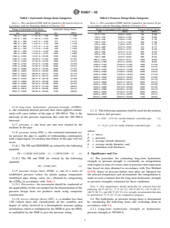 SIGNIFICANCE AND USE 4.1 The procedure for estimating long-term hydrostatic strength or pressure-strength is essentially an extrapolation with respect to time of a stress-time or pressure-time regression line based on data obtained in accordance with Test Method D1598. Stress or pressure-failure time plots are obtained for the selected temperature and environment: the extrapolation is made in such a manner that the long-term hydrostatic strength or pressure strengthis estimated for these conditions. Note 3: Test temperatures should preferably be selected from the following: 68 °F (20 °C), 73 °F (23 °C), 140 °F (60 °C), 176 °F (80 °C), 180 °F (82 °C), and 200 °F (93 °C). It is strongly recommended that data be generated at 73 °F (23 °C) for comparative purposes. 4.2 The hydrostatic or pressure design basis is determined by considering the following items and evaluating them in accordance with 5.4. 4.2.1 Long-term hydrostatic strength or hydrostatic pressure-strength at 100 000 h, 4.2.2 Long-term hydrostatic strength or hydrostatic pressure-strength at 50 years, and 4.2.3 Stress that will give 5 % expansion at 100 000 h. 4.2.4 The intent is to make allowance for the basic stress-strain characteristics of the material, as they relate to time. 4.3 Results obtained at one temperature cannot, with any certainty, be used to estimate values for other temperatures. Therefore, it is essential that hydrostatic or pressure design bases be determined for each specific kind and type of plastic compound and each temperature. Estimates of long-term strengths of materials can be made for a specific temperature provided that calculated values, based on experimental data, are available for temperatures both above and below the temperature of interest. 4.4 Hydrostatic design stresses are obtained by multiplying the hydrostatic design basis values by a service (design) factor. 4.5 Pressure ratings for pipe may be calculated from the hydrostatic design stress (HDS) value for the s... SCOPE 1.1 This test method describes two essentially equivalent procedures: one for obtaining a long-term hydrostatic strength category based on stress, referred to herein as the hydrostatic design basis (HDB); and the other for obtaining a long-term hydrostatic strength category based on pressure, referred to herein as the pressure design basis (PDB). The HDB is based on the material's long-term hydrostatic strength (LTHS),and the PDB is based on the product's long-term hydrostatic pressure-strength (LTHSP). The HDB is a material property and is obtained by evaluating stress rupture data derived from testing pipe made from the subject material. The PDB is a product specific property that reflects not only the properties of the material(s) from which the product is made, but also the influence on product strength by product design, geometry, and dimensions and by the specific method of manufacture. The PDB is obtained by evaluating pressure rupture data. The LTHS is determined by analyzing stress versus time-to-rupture (that is, stress-rupture) test data that cover a testing period of not less than 10 000 h and that are derived from sustained pressure testing of pipe made from the subject material. The data are analyzed by linear regression to yield a best-fit log-stress versus log time-to-fail straight-line equation. Using this equation, the material's mean strength at the 100 000-h intercept (LTHS) is determined by extrapolation. The resultant value of the LTHS determines the HDB strength category to which the material is assigned. The LTHSP is similarly determined except that the determination is based on pressure versus time data that are derived from a particular product. The categorized value of the LTHSP is the PDB. An HDB/PDB is one of a series of preferred long-term strength values. This test method is applicable to all known types of thermoplastic pipe materials and thermoplastic piping products. It is also applicabl...