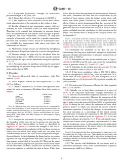 4.1 The procedure for estimating long-term hydrostatic strength or pressure-strength is essentially an extrapolation with respect to time of a stress-time or pressure-time regression line based on data obtained in accordance with Test Method D1598. Stress or pressure-failure time plots are obtained for the selected temperature and environment: the extrapolation is made in such a manner that the long-term hydrostatic strength or pressure strengthis estimated for these conditions.