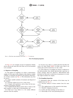 ASTM D6063-11(2018) is a guide published by ASTM International. Its full title is "Standard Guide for Sampling of Drums and Similar Containers by Field Personnel". This standard covers: SIGNIFICANCE AND USE 5.1 This guide is intended to assist field personnel in obtaining samples from drums and similar containers for field and laboratory analysis. The need for accurate data, and the costs associated with sampling and analysis, make it essential that samples be taken correctly before submitting them for chemical analysis or physical testing, or both. Incorrect sampling can invalidate resulting data. 5.2 This guide may be used by personnel who have no formal workplan. It draws their attention to issues that must be addressed before, during, and after taking a sample. It provides guidance in choosing the sampling technique and equipment suitable for specific situations. It can serve as a training tool for those who are unfamiliar with sampling. It is recommended that this guide be used as a supplement to a written workplan. 5.3 Some sections of this guide contain flow charts (see Figs. 1-5) that must be worked through, starting from the top of each page. By answering the questions in the diamond-shaped boxes, and following the appropriate arrows, the person planning to sample will be guided toward the most suitable procedures and equipment. The numbers at the bottom of some boxes refer to corresponding paragraphs in the text, which provide information to help the person sampling answer the questions. FIG. 8 COLIWASA FIG. 9 Concentric Tube Thief FIG. 10 Dipper FIG. 11 Drum Thief FIG. 12 Peristaltic Pumps FIG. 13 Scoop, Spoon, Trowel FIG. 14 Syringe Sampler FIG. 15 Trier SCOPE 1.1 This guide covers information, including flow charts, for field personnel to follow in order to collect samples from drums and similar containers. 1.2 The purpose of this guide is to help field personnel in planning and obtaining samples from drums and similar containers, using equipment and techniques that will ensure that the objectives of the sampling activity will be met. It can also be used as a training tool. 1.3 This standard does not purport to address all of the safety concerns, if any, associated with its use. It is the responsibility of the user of this standard to establish appropriate safety, health, and environmental practices and determine the applicability of regulatory limitations prior to use. See specific warnings in 7.4.3 and 7.4.4. 1.4 This international standard was developed in accordance with internationally recognized principles on standardization established in the Decision on Principles for the Development of International Standards, Guides and Recommendations issued by the World Trade Organization Technical Barriers to Trade (TBT) Committee.