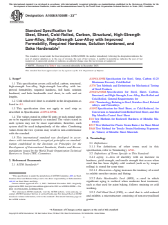 ASTM A1008/A1008M-23e1 is a technical specification published by ASTM International. Its full title is "Standard Specification for Steel, Sheet, Cold-Rolled, Carbon, Structural, High-Strength Low-Alloy, High-Strength Low-Alloy with Improved Formability, Required Hardness, Solution Hardened, and Bake Hardenable". This standard covers: ABSTRACT This specification covers cold-rolled, carbon steel sheets, in coils and cut lengths, in the following designations: commercial steels (CS Types A, B, and C); drawing steel (DS Types A and B); deep drawing steel (DDS); extra deep drawing steel (EDDS); structural steel (SS Grades 25[170], 30[205], 33[230] Types 1 and 2, 40[275] Types 1 and 2, 50[340], 60[410], 70[480], and 80[550]); high-strength low-alloy steel (HSLAS Classes 1 and 2 of Grades 45[310], 50[340]. 55[380], 60[410], 65[450], and 70[480]), high-strength low-alloy steel with improved formability (HSLAS-F Grades 50[340], 60[410], 70[480], and 80[550]); solution hardened steel (SHS); and bake hardenable steel (BHS). Conformance of the steel sheets to chemical composition requirements shall be tested by heat analysis. Specimens shall also undergo tension and bending tests and shall conform to specified values of tensile and yield strength, elongation, and bake hardening index. Unless otherwise indicated, sheet surfaces shall have a matte finish and shall be oiled. SCOPE 1.1 This specification covers cold-rolled, carbon, structural, high-strength low-alloy, high-strength low-alloy with improved formability, required hardness, full hard, solution hardened, and bake hardenable steel sheet, in coils and cut lengths. 1.2 Cold rolled steel sheet is available in the designations as listed in 4.1. 1.3 This specification does not apply to steel strip as described in Specification A109/A109M. 1.4 The values stated in either SI units or inch-pound units are to be regarded separately as standard. The values stated in each system may not be exact equivalents; therefore, each system shall be used independently of the other. Combining values from the two systems may result in non-conformance with the standard. 1.5 This international standard was developed in accordance with internationally recognized principles on standardization established in the Decision on Principles for the Development of International Standards, Guides and Recommendations issued by the World Trade Organization Technical Barriers to Trade (TBT) Committee.