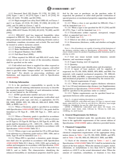 ABSTRACT This specification covers cold-rolled, carbon steel sheets, in coils and cut lengths, in the following designations: commercial steels (CS Types A, B, and C); drawing steel (DS Types A and B); deep drawing steel (DDS); extra deep drawing steel (EDDS); structural steel (SS Grades 25[170], 30[205], 33[230] Types 1 and 2, 40[275] Types 1 and 2, 50[340], 60[410], 70[480], and 80[550]); high-strength low-alloy steel (HSLAS Classes 1 and 2 of Grades 45[310], 50[340]. 55[380], 60[410], 65[450], and 70[480]), high-strength low-alloy steel with improved formability (HSLAS-F Grades 50[340], 60[410], 70[480], and 80[550]); solution hardened steel (SHS); and bake hardenable steel (BHS). Conformance of the steel sheets to chemical composition requirements shall be tested by heat analysis. Specimens shall also undergo tension and bending tests and shall conform to specified values of tensile and yield strength, elongation, and bake hardening index. Unless otherwise indicated, sheet surfaces shall have a matte finish and shall be oiled. SCOPE 1.1 This specification covers cold-rolled, carbon, structural, high-strength low-alloy, high-strength low-alloy with improved formability, required hardness, full hard, solution hardened, and bake hardenable steel sheet, in coils and cut lengths. 1.2 Cold rolled steel sheet is available in the designations as listed in 4.1. 1.3 This specification does not apply to steel strip as described in Specification A109/A109M. 1.4 The values stated in either SI units or inch-pound units are to be regarded separately as standard. The values stated in each system may not be exact equivalents; therefore, each system shall be used independently of the other. Combining values from the two systems may result in non-conformance with the standard. 1.5 This international standard was developed in accordance with internationally recognized principles on standardization established in the Decision on Principles for the Development of International Standards, Guides and Recommendations issued by the World Trade Organization Technical Barriers to Trade (TBT) Committee.