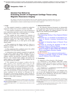 ASTM F3224-17 is a standard published by ASTM International. Its full title is "Standard Test Method for Evaluating Growth of Engineered Cartilage Tissue using Magnetic Resonance Imaging". This standard covers: SIGNIFICANCE AND USE 4.1 Tissue-engineered cartilage is prepared by seeding stem cells or chondrocytes in a three-dimensional biodegradable scaffold under controlled growth conditions. It is expected that the cells will differentiate towards chondrogenic lineage and produce an ample amount of cartilage extracellular matrix proteins, proteoglycans, and collagen type-II. Longitudinal assessment is needed weekly for the first few weeks in vitro and monthly at a later stage in vivo to determine the growth rate of tissue-engineered cartilage. Traditional testing methods such as histological staining, mechanical testing, and qPCR are invasive, destructive, and cannot be performed in vivo after the transplantation of engineered tissue as a regenerative treatment. In the regenerative medicine of cartilage, it is important to evaluate whether the implanted tissue regenerates as an articular cartilage over time. MRI is the only available non-invasive imaging modality that is utilized for post-operative monitoring and assessment of cartilage regeneration in clinics. Therefore, it is important to evaluate tissue-engineered cartilage using MRI at the preclinical stage as well. 4.7.1 The change in calculated relaxation rate, R2(ECM), using Eq 1 have been found to be positively correlated with tissue growth (3, 6). SCOPE 1.1 This standard is intended as a standard test method for engineered cartilage tissue growth evaluation using MRI. 1.2 This standard is intended for use in the development of tissue engineering regenerative medical products for cartilage damages, such as in knee, hip, or shoulder joints. 1.3 This standard has been prepared for evaluation of engineered cartilage tissue growth at the preclinical stage and summarizes results from tissue growth evaluation of tissue-engineered cartilage in a few notable cases using water spin-spin relaxation time, T2, in vitro and in vivo in small animal models. 1.4 This standard uses the change in mean T2 values as a function of growth time to evaluate the tissue growth of engineered cartilage. 1.5 This standard provides a method to remove the scaffold contribution to the tissue growth evaluation. 1.6 Information in this standard is intended to be applicable to most porous natural and synthetic polymers used as a scaffold in engineered cartilage, such as alginate, agarose, collagen, chitosan, and poly-lactic-co-glycolic acid (PLGA). However, some materials (both synthetic and natural) may require unique or varied methods of MRI evaluation that are not covered in this test method. 1.7 This standard does not purport to address all of the safety concerns, if any, associated with its use. It is the responsibility of the user of this standard to establish appropriate safety, health, and environmental practices and determine the applicability of regulatory limitations prior to use. 1.8 This international standard was developed in accordance with internationally recognized principles on standardization established in the Decision on Principles for the Development of International Standards, Guides and Recommendations issued by the World Trade Organization Technical Barriers to Trade (TBT) Committee.