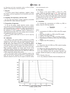 ASTM D7883-20 is a standard published by ASTM International. Its full title is "Standard Test Method for Determination of 4-Carboxybenzaldehyde and <emph type="bdit" >p</emph>-Toluic Acid in Purified Terephthalic Acid by Weak Anion Exchange High Performance Liquid Chromatography". This standard covers: SIGNIFICANCE AND USE 4.1 The presence of 4-CBA and p-TOL in PTA used for the production of polyester is undesirable because they can slow down the polymerization process, and 4-CBA is also imparting coloration to the polymer due to thermal instability. 4.2 Determining the amount of 4-CBA and p-TOL remaining from the manufacture of PTA is often required. This test method is suitable for setting specifications and could be used as an internal quality control tool where these products are produced or are used. SCOPE 1.1 This test method2 covers the determination of the 4-Carboxybenzaldehyde (4-CBA) and p-Toluic acid (p-TOL) in purified terephthalic acid (PTA) by weak anion exchange high performance liquid chromatography (HPLC). This method is applicable for 4-CBA from 2 to 500 mg/kg and for p-TOL from 10 to 500 mg/kg, respectively. 1.2 In determining the conformance of the test results using this method to applicable specification, results shall be rounded off in accordance with the rounding-off method of Practice E29. 1.3 The values stated in SI units are to be regarded as standard. No other units of measurement are included in this standard. 1.4 This standard does not purport to address all of the safety concerns, if any, associated with its use. It is the responsibility of the user of this standard to establish appropriate safety, health, and environmental practices and determine the applicability of regulatory limitations prior to use. 1.5 This international standard was developed in accordance with internationally recognized principles on standardization established in the Decision on Principles for the Development of International Standards, Guides and Recommendations issued by the World Trade Organization Technical Barriers to Trade (TBT) Committee.