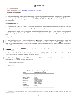 SIGNIFICANCE AND USE 4.1 The presence of 4-CBA and p-TOL in PTA used for the production of polyester is undesirable because they can slow down the polymerization process, and 4-CBA is also imparting coloration to the polymer due to thermal instability. 4.2 Determining the amount of 4-CBA and p-TOL remaining from the manufacture of PTA is often required. This test method is suitable for setting specifications and could be used as an internal quality control tool where these products are produced or are used. SCOPE 1.1 This test method2 covers the determination of the 4-Carboxybenzaldehyde (4-CBA) and p-Toluic acid (p-TOL) in purified terephthalic acid (PTA) by weak anion exchange high performance liquid chromatography (HPLC). This method is applicable for 4-CBA from 2 to 500 mg/kg and for p-TOL from 10 to 500 mg/kg, respectively. 1.2 In determining the conformance of the test results using this method to applicable specification, results shall be rounded off in accordance with the rounding-off method of Practice E29. 1.3 The values stated in SI units are to be regarded as standard. No other units of measurement are included in this standard. 1.4 This standard does not purport to address all of the safety concerns, if any, associated with its use. It is the responsibility of the user of this standard to establish appropriate safety, health, and environmental practices and determine the applicability of regulatory limitations prior to use. 1.5 This international standard was developed in accordance with internationally recognized principles on standardization established in the Decision on Principles for the Development of International Standards, Guides and Recommendations issued by the World Trade Organization Technical Barriers to Trade (TBT) Committee.