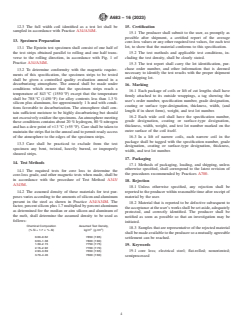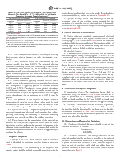 ASTM A683-16(2023) is a technical specification published by ASTM International. Its full title is "Standard Specification for Nonoriented Electrical Steel, Semiprocessed Types". This standard covers: ABSTRACT This specification covers the standard requirements for flat-rolled, nonoriented semiprocessed electrical steel intended primarily for commercial power frequency applications in magnetic devices. These electrical steels are low carbon, silicon-iron, or silicon-aluminum-iron alloys, and are classified according to core-loss. Unlike the fully processed electrical steels covered by ASTM A 677, the electrical steels in this specification require heat treatment by the user to develop the specified magnetic properties. The steels covered by this specification have a thickness of either 0.0185 in. (0.47 mm) or 0.025 in. (0.64 mm). For each thickness there are four core loss types. The core loss shall be determined following the use of a quality evaluation anneal listed in the specification. The core loss is determined using the Epstein test method at a test frequency of 60 Hz and a maximum flux density of 15 kG (1.5 T). Test methods to determine other required physical and mechanical properties are listed. Other typical magnetic and physical properties are listed for reference. SCOPE 1.1 This specification covers the detailed requirements to which flat-rolled, nonoriented semiprocessed electrical steel shall conform. 1.2 This steel is produced to specified maximum core-loss values and is intended primarily for commercial power frequency (50 Hz and 60 Hz) applications in magnetic devices. Desirable core-loss and permeability characteristics are developed through heat treatment by the user. 1.3 These nonoriented, semiprocessed electrical steels are low carbon, silicon-iron or silicon-aluminum-iron alloys containing up to about 2.5 % silicon and less than 1 % aluminum. 1.4 The values stated in SI units are to be regarded as standard. The values given in parentheses are mathematical conversions to customary (cgs-emu and inch-pound) units which are provided for information only and are not considered standard. 1.5 This international standard was developed in accordance with internationally recognized principles on standardization established in the Decision on Principles for the Development of International Standards, Guides and Recommendations issued by the World Trade Organization Technical Barriers to Trade (TBT) Committee.