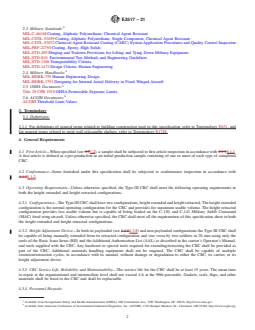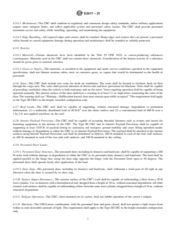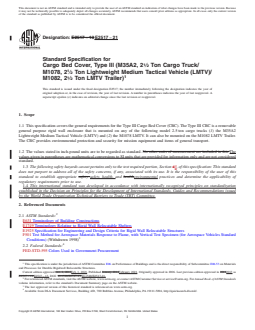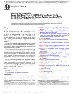 ASTM E2517-21 is a technical specification published by ASTM International. Its full title is "Standard Specification for Cargo Bed Cover, Type III (M35A2, 2<fraction><num>1</num><den >2</den></fraction> Ton Cargo Truck/M1078, 2<fraction><num>1</num><den >2</den></fraction> Ton Lightweight Medium Tactical Vehicle (LMTV)/ M1082, 2<fraction><num>1</num><den>2</den></fraction> Ton LMTV Trailer)". This standard covers: ABSTRACT This specification covers the general requirements for the Type III cargo bed cover (CBC). The Type III cargo bed cover is a removable general purpose rigid enclosure for the cargo bed of the 2-1/2 ton cargo truck (M35A2), 2-1/2 ton lightweight medium tactical vehicle (LMTV; M1078), and 2-1/2 ton LMTV trailer (M1082). The CBC provides environmental protection and security for mission equipment and items of general transport. SCOPE 1.1 This specification covers the general requirements for the Type III Cargo Bed Cover (CBC). The Type III CBC is a removable general purpose rigid wall enclosure that is mounted on any of the following model 2.5 ton cargo trucks (1) the M35A2 Lightweight Medium Tactical Vehicle (LMTV) and (2) the M1078 LMTV. It can also be mounted on the M1082 LMTV Trailer. The CBC provides environmental protection and security for mission equipment and items of general transport. 1.2 The values stated in inch-pound units are to be regarded as standard. The values given in parentheses are mathematical conversions to SI units that are provided for information only and are not considered standard. 1.3 The following safety hazards caveat pertains only to the test required portion, Section 5, of this specification: This standard does not purport to address all of the safety concerns, if any, associated with its use. It is the responsibility of the user of this standard to establish appropriate safety, health, and environmental practices and determine the applicability of regulatory requirements prior to use. 1.4 This international standard was developed in accordance with internationally recognized principles on standardization established in the Decision on Principles for the Development of International Standards, Guides and Recommendations issued by the World Trade Organization Technical Barriers to Trade (TBT) Committee.