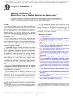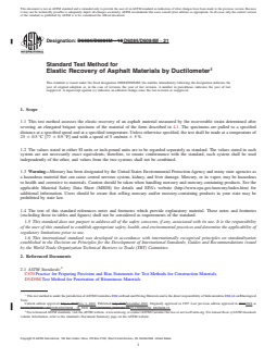 SIGNIFICANCE AND USE 3.1 This test method is useful in confirming that a material has been added to the asphalt to provide a significant elastomeric characteristic. It does not necessarily identify the type or amount of material added. Note 1: The quality of results produced by this standard is dependent on the competence of the personnel performing the procedure and the capability, calibration, and maintenance of the equipment used. Agencies that meet the criteria of Specification D3666 are generally considered capable of competent and objective testing, sampling, inspection, etc. Users of this standard are cautioned that compliance with Specification D3666 alone does not completely ensure reliable results. Reliable results depend on many factors; following the suggestions of Specification D3666 or some similar acceptable guidance provides a means of evaluating and controlling some of those factors. SCOPE 1.1 This test method assesses the elastic recovery of an asphalt material measured by the recoverable strain determined after severing an elongated briquet specimen of the material of the form described in 4.1. The specimens are pulled to a specified distance at a specified speed and at a specified temperature. Unless otherwise specified, the test shall be made at a temperature of 25 ± 0.5 °C [77 ± 0.9 °F] and with a speed of 5 cm/min ± 5 %. 1.2 The values stated in either SI units or inch-pound units are to be regarded separately as standard. The values stated in each system are not necessarily exact equivalents; therefore, to ensure conformance with the standard, each system shall be used independently of the other, and values from the two systems shall not be combined. 1.3 Warning—Mercury has been designated by the United States Environmental Protection Agency and many state agencies as a hazardous material that can cause central nervous system, kidney, and liver damage. Mercury, or its vapor, may be hazardous to health and corrosive to materials. Caution should be taken when handling mercury and mercury-containing products. See the applicable Material Safety Data Sheet (MSDS) for details and EPA’s website (http://www.epa.gov/mercury/index.htm) for additional information. Users should be aware that selling mercury and/or mercury-containing products in your state may be prohibited by state law. 1.4 The text of this standard references notes and footnotes which provide explanatory material. These notes and footnotes (excluding those in tables and figures) shall not be considered as requirements of the standard. 1.5 This standard does not purport to address all of the safety concerns, if any, associated with its use. It is the responsibility of the user of this standard to establish appropriate safety, health, and environmental practices and determine the applicability of regulatory limitations prior to use. 1.6 This international standard was developed in accordance with internationally recognized principles on standardization established in the Decision on Principles for the Development of International Standards, Guides and Recommendations issued by the World Trade Organization Technical Barriers to Trade (TBT) Committee.