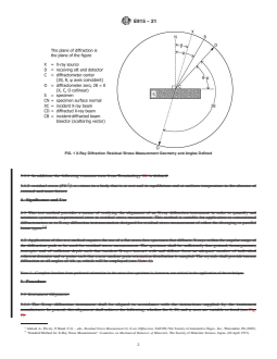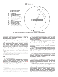 SIGNIFICANCE AND USE 4.1 This practice provides a means of verifying the alignment of an X-ray diffraction instrument so as to quantify and minimize systematic experimental error in residual stress measurements. This practice is suitable for application to conventional X-ray diffraction instruments or to X-ray diffraction residual stress measurement instruments of either the diverging or parallel beam types3,4 4.2 Application of this practice requires the use of a flat stress-free specimen that diffracts X-rays within the angular range of the diffraction peak to be used for subsequent residual stress measurements. The specimen shall have sufficiently small coherent domains or grains, be quasi-homogeneous, quasi-isotropic, and be of sufficient thickness such that incident X-rays interact with and diffract from an adequate number of individual coherent domains or grains such that a near-random grain orientation distribution is sampled. The crystals shall provide intense diffraction at all tilt angles ψ that will be employed. Note 1: A major bias in crystal structure orientation is undesirable, but complete freedom from preferred orientation in the stress-free specimen is not critical in the application of the technique. SCOPE 1.1 This practice describes the procedure for verifying the alignment of X-ray diffraction instruments used for residual stress measurements. 1.2 This practice further describes the use of iron powder for fabrication of a stress-free test specimen to be used to quantify the systematic error that can occur in residual stress measurement of ferritic or martensitic steels. This practice is easily adapted to other alloys and ceramics by the use of a powder having a similar diffraction angle to the material to be measured. 1.3 This practice is applicable to all X-ray diffraction instruments that measure diffracted X-rays from the crystal structure of a polycrystalline specimen. It is applicable to the acceptable multiple exposure techniques of residual stress measurement as defined in Test Method E2860. Through measurement of a high-angle back-reflection set of planes, these techniques are used to derive the interatomic spacing (d-spacing) and the crystallographic strain, and then calculate residual stress in which the θ, 2θ, and ψ rotation axes can be made to coincide (see Fig. 1). FIG. 1 X-Ray Diffraction Residual Stress Measurement Geometry and Angles Defined 1.4 Units—The values stated in SI units are to be regarded as standard. The values given in parentheses after SI units are provided for information only and are not considered standard. 1.5 This standard does not purport to address all of the safety concerns, if any, associated with its use. It is the responsibility of the user of this standard to establish appropriate safety, health, and environmental practices and determine the applicability of regulatory limitations prior to use. 1.6 This international standard was developed in accordance with internationally recognized principles on standardization established in the Decision on Principles for the Development of International Standards, Guides and Recommendations issued by the World Trade Organization Technical Barriers to Trade (TBT) Committee.