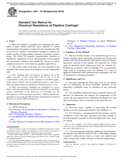 SIGNIFICANCE AND USE 4.1 The data obtained for short-term tests are of interest only in eliminating the most unsuitable materials or for indicating a probable order of resistance in any particular media. 4.2 Test conditions should take into account the manner and duration of immersion, the reagent, the temperature of the system, the area exposed above and below the liquid level, and other performance factors selected for the particular test. SCOPE 1.1 This test method is intended for evaluating the resistance of pipe coating materials when exposed to various concentrations of reagents or suspected soil contaminants. The test serves as a guide to investigators wishing to compare the relative merits of pipe-coating materials in specific environments. The choice of reagents, concentrations, duration of immersion, temperature of test, and properties to be reported are necessarily arbitrary and should be chosen to reflect conditions known to exist along the pipeline right-of-way. 1.2 The values stated in SI units are to be regarded as the standard. The values given in parentheses are for information only. 1.3 This standard does not purport to address all of the safety concerns, if any, associated with its use. It is the responsibility of the user of this standard to establish appropriate safety, health, and environmental practices and determine the applicability of regulatory limitations prior to use. 1.4 This international standard was developed in accordance with internationally recognized principles on standardization established in the Decision on Principles for the Development of International Standards, Guides and Recommendations issued by the World Trade Organization Technical Barriers to Trade (TBT) Committee.