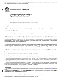 SIGNIFICANCE AND USE 4.1 The purpose of this classification system is to provide a method of adequately identifying plastic materials in order to give industry a system that can be used universally for plastic materials. It further provides a means for specifying these materials by the use of a simple line call-out designation. 4.2 This classification system was developed to permit the addition of property values for future plastics. SCOPE 1.1 This standard provides a classification system for tabulating the properties of unfilled, filled, and reinforced plastic materials suitable for processing into parts. Note 1: The classification system serves many of the needs of industries using plastic materials. The standard is subject to revision as the need requires; therefore, the latest revision should always be used. 1.2 The classification system and subsequent line call-out (specification) is intended to be a means of identifying plastic materials used in the fabrication of end items or parts. It is not intended for the selection of materials. Material selection should be made by those having expertise in the plastics field after careful consideration of the design and the performance required of the part, the environment to which it will be exposed, the fabrication process to be employed, the inherent properties of the material not covered in this document, and the economic factors. 1.3 This classification system is based on the premise that plastic materials can be arranged into broad generic families using basic properties to arrange the materials into groups, classes, and grades. A system is thus established which, together with values describing additional requirements, permits as complete a description as desired of the selected material. 1.4 In all cases where the provisions of this classification system would conflict with the referenced ASTM specification for a particular material, the latter shall take precedence. Note 2: When using this classification system the two-letter, three-digit suffix system applies. Note 3: When a material is used to fabricate a part where the requirements are too specific for a broad material call-out, it is advisable for the user to consult the supplier to secure a call-out of the properties to suit the actual conditions to which the part is to be subjected. 1.5 This standard does not purport to address all of the safety concerns, if any, associated with its use. It is the responsibility of the user of this standard to establish appropriate safety, health, and environmental practices and determine the applicability of regulatory limitations prior to use. 1.6 This international standard was developed in accordance with internationally recognized principles on standardization established in the Decision on Principles for the Development of International Standards, Guides and Recommendations issued by the World Trade Organization Technical Barriers to Trade (TBT) Committee.