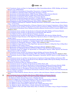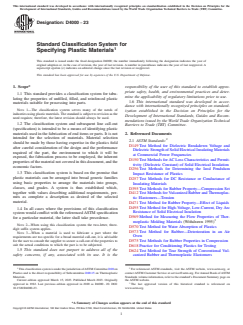 ASTM D4000-23 is a standard published by ASTM International. Its full title is "Standard Classification System for Specifying Plastic Materials". This standard covers: SIGNIFICANCE AND USE 4.1 The purpose of this classification system is to provide a method of adequately identifying plastic materials in order to give industry a system that can be used universally for plastic materials. It further provides a means for specifying these materials by the use of a simple line call-out designation. 4.2 This classification system was developed to permit the addition of property values for future plastics. SCOPE 1.1 This standard provides a classification system for tabulating the properties of unfilled, filled, and reinforced plastic materials suitable for processing into parts. Note 1: The classification system serves many of the needs of industries using plastic materials. The standard is subject to revision as the need requires; therefore, the latest revision should always be used. 1.2 The classification system and subsequent line call-out (specification) is intended to be a means of identifying plastic materials used in the fabrication of end items or parts. It is not intended for the selection of materials. Material selection should be made by those having expertise in the plastics field after careful consideration of the design and the performance required of the part, the environment to which it will be exposed, the fabrication process to be employed, the inherent properties of the material not covered in this document, and the economic factors. 1.3 This classification system is based on the premise that plastic materials can be arranged into broad generic families using basic properties to arrange the materials into groups, classes, and grades. A system is thus established which, together with values describing additional requirements, permits as complete a description as desired of the selected material. 1.4 In all cases where the provisions of this classification system would conflict with the referenced ASTM specification for a particular material, the latter shall take precedence. Note 2: When using this classification system the two-letter, three-digit suffix system applies. Note 3: When a material is used to fabricate a part where the requirements are too specific for a broad material call-out, it is advisable for the user to consult the supplier to secure a call-out of the properties to suit the actual conditions to which the part is to be subjected. 1.5 This standard does not purport to address all of the safety concerns, if any, associated with its use. It is the responsibility of the user of this standard to establish appropriate safety, health, and environmental practices and determine the applicability of regulatory limitations prior to use. 1.6 This international standard was developed in accordance with internationally recognized principles on standardization established in the Decision on Principles for the Development of International Standards, Guides and Recommendations issued by the World Trade Organization Technical Barriers to Trade (TBT) Committee.