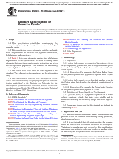 ASTM D5724-16(2021) is a technical specification published by ASTM International. Its full title is "Standard Specification for Gouache Paints". This standard covers: ABSTRACT This specification establishes the requirements for composition, physical properties, performance, and labeling of gouache paints. Covered here are pigments, vehicles, and additives, wherein the requirements for which are included for pigment identification, lightfastness, and consistency. Some pigments meeting the lightfastness requirements in this specification are listed herein. Also, in order to identify other pigments that meet these requirements, instructions are given for test specimen preparation and the respective test methods for determining relative lightfastness. The conditions not covered in this specification that affect gouache paints are substrate, environmental conditions, storage, vehicles, pigments, additives, inerts, preparation of samples, coarse particles, fineness of dispersions, consistency, freeze-thaw stability, opacity (hiding power), bleeding, and color specification. SIGNIFICANCE AND USE 4.1 This specification establishes quality requirements and provides a basis for common understanding among producers, distributors, and users. 4.2 It is not intended that all paints meeting the requirements be identical nor of uniform excellence in all respects. Variations in manufacture, not covered by this specification, may cause some artists to prefer one brand over another, either of which may be acceptable under this specification. SCOPE 1.1 This specification establishes requirements for composition, physical properties, performance, and labeling of gouache paints. 1.2 This specification covers pigments, vehicles, and additives. Requirements are included for pigment identification, lightfastness, and consistency. 1.3 Table 1 lists some pigments meeting the lightfastness requirements in this specification. In order to identify other pigments that meet these requirements, instructions are given for test specimen preparation. Test methods for determining relative lightfastness are referenced. 1.4 The values stated in SI units are to be regarded as the standard. The values given in parentheses are for information only. 1.5 This international standard was developed in accordance with internationally recognized principles on standardization established in the Decision on Principles for the Development of International Standards, Guides and Recommendations issued by the World Trade Organization Technical Barriers to Trade (TBT) Committee.