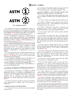 ABSTRACT This specification establishes the requirements for composition, physical properties, performance, and labeling of gouache paints. Covered here are pigments, vehicles, and additives, wherein the requirements for which are included for pigment identification, lightfastness, and consistency. Some pigments meeting the lightfastness requirements in this specification are listed herein. Also, in order to identify other pigments that meet these requirements, instructions are given for test specimen preparation and the respective test methods for determining relative lightfastness. The conditions not covered in this specification that affect gouache paints are substrate, environmental conditions, storage, vehicles, pigments, additives, inerts, preparation of samples, coarse particles, fineness of dispersions, consistency, freeze-thaw stability, opacity (hiding power), bleeding, and color specification. SIGNIFICANCE AND USE 4.1 This specification establishes quality requirements and provides a basis for common understanding among producers, distributors, and users. 4.2 It is not intended that all paints meeting the requirements be identical nor of uniform excellence in all respects. Variations in manufacture, not covered by this specification, may cause some artists to prefer one brand over another, either of which may be acceptable under this specification. SCOPE 1.1 This specification establishes requirements for composition, physical properties, performance, and labeling of gouache paints. 1.2 This specification covers pigments, vehicles, and additives. Requirements are included for pigment identification, lightfastness, and consistency. 1.3 Table 1 lists some pigments meeting the lightfastness requirements in this specification. In order to identify other pigments that meet these requirements, instructions are given for test specimen preparation. Test methods for determining relative lightfastness are referenced. 1.4 The values stated in SI units are to be regarded as the standard. The values given in parentheses are for information only. 1.5 This international standard was developed in accordance with internationally recognized principles on standardization established in the Decision on Principles for the Development of International Standards, Guides and Recommendations issued by the World Trade Organization Technical Barriers to Trade (TBT) Committee.