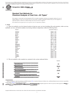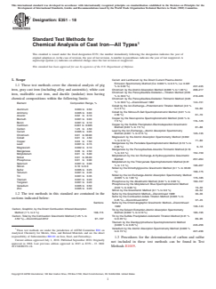 1.1 These test methods cover the chemical analysis of pig iron, gray cast iron (including alloy and austenitic), white cast iron, malleable cast iron, and ductile (nodular) iron having chemical compositions within the following limits: