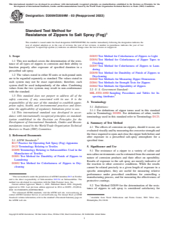 ASTM D2059/D2059M-03(2022) is a standard published by ASTM International. Its full title is "Standard Test Method for Resistance of Zippers to Salt Spray (Fog)". This standard covers: SIGNIFICANCE AND USE 5.1 The resistance of a zipper to a variety of saline and non-saline environments can be estimated from the amount and nature of corrosion products and their effect on operability. Results of exposure to the salt spray are merely indicative of the reaction to other corrosive conditions. While the results cannot be related precisely to a given length of exposure in a specific atmosphere, they are useful for measuring relative performance under prescribed conditions for controlling a manufacturing process, and for measuring the effectiveness of protective coatings. 5.2 Test Method D2059 for the determination of the resistance of zippers to salt spray is considered satisfactory for acceptance testing of commercial shipments of zippers because the test method is used extensively in the trade for acceptance testing. 5.2.1 If there are differences of practical significance between reported test results for two laboratories (or more), comparative test should be performed to determine if there is a statistical bias between them, using competent statistical assistance. As a minimum, the test samples should be used that are as homogeneous as possible, that are drawn from the material from which the disparate test results were obtained, and that are randomly assigned in equal numbers to each laboratory for testing. Other materials with established test values may be used for this purpose. The test results from the two laboratories should be compared using a statistical test for unpaired data, at a probability level chosen prior to the testing series. If a bias is found, either its cause must be found and corrected, or future test results must be adjusted in consideration of the known bias. 5.3 The method(s) in the standard along with those in Test Methods D2051, D2052, D2053, D2054, D2057, D2058, D2060, D2061, and D2062 are a collection of proven test methods. They can be used as aids in the evaluation of zippers without the need for a thorough knowledge of zippers. T... SCOPE 1.1 This test method covers the determination of the resistance of all types of zippers to corrosion and their ability to function properly after exposure of specified duration in a prescribed salt spray. 1.2 The values stated in either SI units or inch-pound units are to be regarded separately as standard. The values stated in each system may not be exact equivalents; therefore, each system shall be used independently of the other. Combining values from the two systems may result in non-conformance with the standard. 1.3 This standard does not purport to address all of the safety concerns, if any, associated with its use. It is the responsibility of the user of this standard to establish appropriate safety, health, and environmental practices and determine the applicability of regulatory limitations prior to use. 1.4 This international standard was developed in accordance with internationally recognized principles on standardization established in the Decision on Principles for the Development of International Standards, Guides and Recommendations issued by the World Trade Organization Technical Barriers to Trade (TBT) Committee.