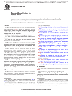 ABSTRACT This specification covers two types of commercial rolled zinc. Type I are coils or sheets cut from strip rolled zinc, and Type II are zinc plates such as boiler and hull plates produced by any rolling method. The products shall be produced by casting, rolling, and other processes found in mill product plant. The material shall be tested and conform to the required chemical composition. The testing of wrought zinc for determination of tensile properties shall be conducted. The testing of zinc for hardness shall be made on a Rockwell superficial hardness tester or on a microhardness tester. The determination of chemical composition shall be performed by either an appropriate chemical method or by optical emission spectrographic methods. SCOPE 1.1 This specification covers two types of commercial rolled zinc as described in 1.2. It should be understood that the specification is general. Any closer limitations on permissible variations shall be a matter of agreement between the supplier (manufacturer) and the purchaser. 1.2 Rolled zinc is furnished in two types as follows: 1.2.1 Type A—Coils or sheets cut from strip (ribbon) rolled zinc and 1.2.2 Type B—Zinc plates such as boiler and hull plates produced by any rolling method. 1.3 The values stated in inch-pound units are to be regarded as standard. The values given in parentheses are mathematical conversions to SI units that are provided for information only and are not considered standard. 1.4 This standard does not purport to address all of the safety concerns, if any, associated with its use. It is the responsibility of the user of this standard to become familiar with all hazards including those identified in the appropriate Safety Data Sheet (SDS) for this product/material as provided by the manufacturer, to establish appropriate safety, health, and environmental practices, and determine the applicability of regulatory limitations prior to use. 1.5 This international standard was developed in accordance with internationally recognized principles on standardization established in the Decision on Principles for the Development of International Standards, Guides and Recommendations issued by the World Trade Organization Technical Barriers to Trade (TBT) Committee.