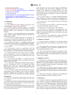 ASTM E2144-21 is a standard published by ASTM International. Its full title is "Standard Practice for Personal Sampling and Analysis of Endotoxin in Metalworking Fluid Aerosols in Workplace Atmospheres". This standard covers: SIGNIFICANCE AND USE 5.1 Endotoxins in metalworking fluid aerosols present potential respiratory health hazards to workers who inhale them. Therefore, a consensus standard is needed to provide reliable data on workplace airborne endotoxin concentrations where metalworking fluids are used. 5.2 This practice for measuring airborne endotoxin concentrations in metalworking fluid atmospheres will help to foster a better understanding of endotoxin exposure-response relationships. 5.3 This practice facilitates comparisons of interlaboratory data from methods and field investigative studies. SCOPE 1.1 This practice covers quantitative methods for the personal sampling and determination of bacterial endotoxin concentrations in poly-disperse metalworking fluid aerosols in workplace atmospheres. Users should have fundamental knowledge of microbiological techniques and endotoxin testing. 1.2 Users of this practice may obtain personal or area exposure data of endotoxin in metalworking fluid aerosols, either on a short-term or full-shift basis in workplace atmospheres. 1.3 This practice gives an estimate of the endotoxin concentration of the sampled atmosphere. 1.4 This practice seeks to minimize interlaboratory variation but does not ensure uniformity of results. 1.5 It is anticipated that this practice will facilitate interlaboratory comparisons of airborne endotoxin data from metalworking fluid atmospheres, particularly metal removal fluid atmospheres, by providing a basis for endotoxin sampling, extraction, and analytical methods. 1.6 In 1997, the Occupational Safety and Health Administration (OSHA) empanelled a Standards Advisory Committee to make recommendations to the Administration regarding measures that the Administration could take to improve the health of workers exposed to metalworking fluids. A report to the Assistant Secretary of Labor for OSHA was submitted in July 1999. Subcommittee E34.50 believes that the user community would benefit significantly if a standard method was developed to give the community guidance on a methodology for the sampling and analysis of personal airborne endotoxin exposure assessments in facilities using water-miscible metal removal fluids, based on the LAL assay or other endotoxin detection technologies as they become available. 1.7 This practice does not attempt to set or imply limits for personal exposure to endotoxin in metalworking fluid aerosols in workplace environments. 1.8 Units—The values stated in SI units are to be regarded as standard. No other units of measurement are included in this standard. 1.9 This standard does not purport to address all of the safety concerns, if any, associated with its use. It is the responsibility of the user of this standard to establish appropriate safety, health, and environmental practices and determine the applicability of regulatory limitations prior to use. 1.10 This international standard was developed in accordance with internationally recognized principles on standardization established in the Decision on Principles for the Development of International Standards, Guides and Recommendations issued by the World Trade Organization Technical Barriers to Trade (TBT) Committee.