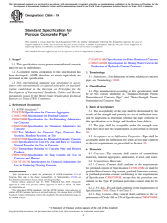 ABSTRACT This specification covers porous nonreinforced concrete pipe for use in underdrains. Pipe manufactured according to this specification shall be of two classes identified as “standard porous nonreinforced concrete pipe”, and “extra-strength porous nonreinforced concrete pipe. ” The concrete shall consist of cementitious materials, mineral, aggregates, and water. The joints shall be of such design and the ends of the concrete pipe sections so formed that the pipe can be laid together to make a continuous line pipe. The aggregates shall be sized, graded, proportioned, and mixed with such proportions of cementitious materials, and water as will produce a homogeneous concrete mixture of such quality that the pipe will conform to test and design requirements. Pipe shall be subjected to curing. Special shapes or fittings for use with concrete pipe conforming to this specification shall be made of porous or nonporous concrete in such manner as will provide strength at least equal to the class of the adjacent pipe to which they are joined; and shall conform to all other requirements specified for pipe. The test pipe shall freed from all visible moisture. When dry, each pipe shall be measured and inspected. The crushing strength of the porous material as well as its infiltration, shall conform to the requirements. SCOPE 1.1 This specification covers porous nonreinforced concrete pipe for use in underdrains. 1.2 A complete metric companion to this specification has been developed— 654M; therefore, no metric equivalents are presented in this specification. 1.3 This international standard was developed in accordance with internationally recognized principles on standardization established in the Decision on Principles for the Development of International Standards, Guides and Recommendations issued by the World Trade Organization Technical Barriers to Trade (TBT) Committee.