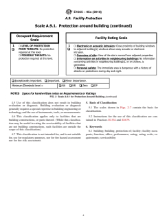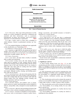 SIGNIFICANCE AND USE 4.1 Each Facility Rating Scale (see Figs. 2-7) in this classification provides a means to estimate the level of serviceability of a building or facility for one topic of serviceability and to compare that level against the level of any other building or facility. 4.2 This classification can be used for comparing how well different buildings or facilities meet a particular requirement for serviceability. It is applicable despite differences such as location, structure, mechanical systems, age, and building shape. 4.3 This classification can be used to estimate the amount of variance of serviceability from target or from requirement, for a single office facility, or within a group of office facilities. 4.4 This classification can be used to estimate the following: 4.4.1 Serviceability of an existing facility for uses other than its present use. 4.4.2 Serviceability (potential) of a facility that has been planned but not yet built. 4.4.3 Serviceability (potential) of a facility for which remodeling has been planned. 4.5 Use of this classification does not result in building evaluation or diagnosis. Building evaluation or diagnosis generally requires a special expertise in building engineering or technology and the use of instruments, tools, or measurements. 4.6 This classification applies only to facilities that are building constructions, or parts thereof. (While this classification may be useful in rating the serviceability of facilities that are not building constructions, such facilities are outside the scope of this classification.) 4.7 This classification is not intended for, and is not suitable for, use for regulatory purposes, nor for fire hazard assessment nor for fire risk assessment. SCOPE 1.1 This classification covers pairs of scales for classifying an aspect of the serviceability of an office facility, that is, the capability of an office facility to meet certain possible requirements for protection of a building or site. 1.2 Within that aspect of serviceability, each pair of scales, shown in Figs. 2-7, are for classifying one topic of serviceability. Each paragraph in an Occupant Requirement Scale (see Figs. 2-7) summarizes one level of serviceability on that topic, which occupants might require. The matching entry in the Facility Rating Scale (see Figs. 2-7) is a translation of the requirement into a description of certain features of a facility which, taken in combination, indicate that the facility is likely to meet that level of required serviceability. FIG. 1 Zones of Physical Security FIG. 2 Scale A.9.1 for Protection Around Building FIG. 2 Scale A.9.1 for Protection Around Building (continued) FIG. 3 Scale A.9.2 for Protection from Unauthorized Access to Site and Parking FIG. 3 Scale A.9.2 for Protection from Unauthorized Access to Site and Parking (continued) FIG. 4 Scale A.9.3 for Protective Surveillance of Site FIG. 4 Scale A.9.3 for Protective Surveillance of Site (continued) FIG. 5 Scale A.9.4 for Perimeter of Building FIG. 5 Scale A.9.4 for Perimeter of Building (continued) FIG. 6 Scale A.9.5 for Public Zone of Building FIG. 6 Scale A.9.5 for Public Zone of Building (continued) FIG. 7 Scale A.9.6 for Facility Protection Services FIG. 7 Scale A.9.6 for Facility Protection Services (continued) 1.3 The entries in the Facility Rating Scale (see Figs. 2-7) are indicative and not comprehensive. They are for quick scanning to estimate approximately, quickly, and economically, how well an office facility is likely to meet the needs of one or another type of occupant group over time. The entries are not for measuring, knowing, or evaluating how an office facility is performing. 1.4 This classification can be used to estimate the level of serviceability of an existing facility. It can also be used to estimate the serviceability of a facility that has been planned but not yet built, such as one for which single-line...
