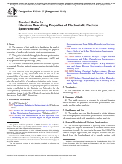 ASTM E1016-07(2020) is a guide published by ASTM International. Its full title is "Standard Guide for Literature Describing Properties of Electrostatic Electron Spectrometers". This standard covers: SIGNIFICANCE AND USE 5.1 The analyst may use this document to obtain information on the properties of electron spectrometers and instrumental aspects associated with quantitative surface analysis. SCOPE 1.1 The purpose of this guide is to familiarize the analyst with some of the relevant literature describing the physical properties of modern electrostatic electron spectrometers. 1.2 This guide is intended to apply to electron spectrometers generally used in Auger electron spectroscopy (AES) and X-ray photoelectron spectroscopy (XPS). 1.3 The values stated in inch-pound units are to be regarded as standard. No other units of measurement are included in this standard. 1.4 This standard does not purport to address all of the safety concerns, if any, associated with its use. It is the responsibility of the user of this standard to establish appropriate safety, health, and environmental practices and determine the applicability of regulatory limitations prior to use. 1.5 This international standard was developed in accordance with internationally recognized principles on standardization established in the Decision on Principles for the Development of International Standards, Guides and Recommendations issued by the World Trade Organization Technical Barriers to Trade (TBT) Committee.