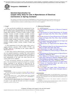 ASTM B888/B888M-19 is a technical specification published by ASTM International. Its full title is "Standard Specification for Copper Alloy Strip for Use in Manufacture of Electrical Connectors or Spring Contacts". This standard covers: ABSTRACT This specification establishes the requirements for copper alloy strips for use in the manufacture of electrical connectors or spring contacts produced from one of the following Copper Alloy UNS Nos.: C14530, C15100, C15500, C17000, C17200, C17410, C17450, C17460, C17500, C17510, C19010, C19025, C19210, C19400, C19500, C19700, C23000, C26000, C40810, C40850, C40860, C42200, C42500, C42520, C42600, C50580, C50780, C51000, C51080, C51100, C51180, C51980, C52100, C52180, C52480, C63800, C65400, C68800, C70250, C70260, C70265, C75200, and C76200. The material for manufacture shall be a cast bar, slab, cake, billet, or other form of such composition as to be suitable for processing by either hot- or cold-working to produce the products prescribed in this specification. Products shall be finished by hot working, cold working, annealing, or heat treatment as may be necessary to meet mechanical property requirements, which include tensile strength, yield strength, and elongation. Tempers shall be available in the annealed, rolled, or mill hardened conditions. Products shall also adhere to tolerances as to dimension such as thickness, width, length, straightness, and mass. SCOPE 1.1 This specification establishes the requirements for copper alloy strip for use in the manufacture of electrical connectors or spring contacts produced from one of the following Copper Alloy UNS Nos.:2 C14530, C15100, C15500, C17000, C17200, C17410, C17450, C17460, C17500, C17510, C19002, C19010, C19015, C19025, C19210, C19400, C19500, C19700, C23000, C26000, C40810, C40850, C40860, C42200, C42500, C42520, C42600, C50580, C50780, C51000, C51080, C51100, C51180, C51980, C52100, C52180, C52480, C63800, C64725, C65400, C68800, C70250, C70260, C70265, C70310, C70350, C75200, and C76200. 1.2 The requirements for the other copper alloys such as copper-nickel-tin spinodal, UNS C72650, C72700, and C72900, shall be as prescribed in the current edition of Specification B740. 1.3 The values stated in either SI units or inch-pound units are to be regarded separately as standard. The values stated in each system are not necessarily exact equivalents; therefore, to ensure conformance with the standard, each system shall be used independently of the other, and values from the two systems shall not be combined. 1.4 This international standard was developed in accordance with internationally recognized principles on standardization established in the Decision on Principles for the Development of International Standards, Guides and Recommendations issued by the World Trade Organization Technical Barriers to Trade (TBT) Committee.