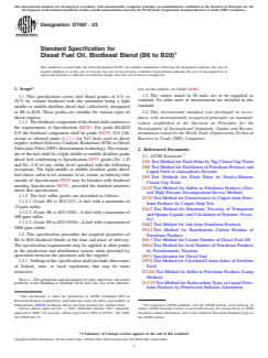 ASTM D7467-23 is a technical specification published by ASTM International. Its full title is "Standard Specification for Diesel Fuel Oil, Biodiesel Blend (B6 to B20)". This standard covers: SCOPE 1.1 This specification covers fuel blend grades of 6 % to 20 % by volume biodiesel with the remainder being a light middle or middle distillate diesel fuel, collectively designated as B6 to B20. These grades are suitable for various types of diesel engines. 1.1.1 The biodiesel component of the blend shall conform to the requirements of Specification D6751. For grade B6-B20 S15 the biodiesel component shall be grade D6751 S15 LM, except as allowed under 6.1.1.1 for S15 fuels used in diesel engines without Selective Catalytic Reduction (SCR) or Diesel Particulate Filter (DPF) aftertreatment technology. The remainder of the fuel shall be a light middle or middle distillate grade diesel fuel conforming to Specification D975 grades No. 1-D and No. 2-D of any sulfur level specified with the following exceptions. The light middle or middle distillate grade diesel fuel whose sulfur level, aromatic level, cetane, or lubricity falls outside of Specification D975 may be blended with biodiesel meeting Specification D6751, provided the finished mixtures meets this specification. 1.1.2 The fuel sulfur grades are described as follows: 1.1.2.1 Grade B6 to B20 S15—A fuel with a maximum of 15 ppm sulfur. 1.1.2.2 Grade B6 to B20 S500—A fuel with a maximum of 500 ppm sulfur. 1.1.2.3 Grade B6 to B20 S5000—A fuel with a maximum of 5000 ppm sulfur. 1.2 This specification prescribes the required properties of B6 to B20 biodiesel blends at the time and place of delivery. The specification requirements may be applied at other points in the production and distribution system when provided by agreement between the purchaser and the supplier. 1.2.1 Nothing in this specification shall preclude observance of federal, state, or local regulations that may be more restrictive. Note 1: The generation and dissipation of static electricity can create problems in the handling of distillate diesel fuel oils. For more information on this subject, see Guide D4865. 1.3 The values stated in SI units are to be regarded as standard. No other units of measurement are included in this standard. 1.4 This international standard was developed in accordance with internationally recognized principles on standardization established in the Decision on Principles for the Development of International Standards, Guides and Recommendations issued by the World Trade Organization Technical Barriers to Trade (TBT) Committee.