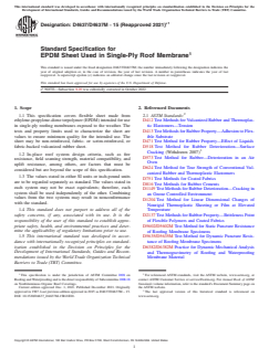 ASTM D4637/D4637M-15(2021)e1 is a technical specification published by ASTM International. Its full title is "Standard Specification for EPDM Sheet Used in Single-Ply Roof Membrane". This standard covers: SCOPE 1.1 This specification covers flexible sheet made from ethylene-propylene-diene terpolymer (EPDM) intended for use in single-ply roofing membranes exposed to the weather. The tests and property limits used to characterize the sheet are values to ensure minimum quality for the intended use. The sheet may be non-reinforced, fabric- or scrim-reinforced, or fabric-backed vulcanized rubber sheet. 1.2 In-place roof system design criteria, such as fire resistance, field seaming strength, material compatibility, and uplift resistance, among others, are factors that must be considered but are beyond the scope of this specification. 1.3 The values stated in either SI units or inch-pound units are to be regarded separately as standard. The values stated in each system may not be exact equivalents; therefore, each system shall be used independently of the other. Combining values from the two systems may result in nonconformance with the standard. 1.4 This standard does not purport to address all of the safety concerns, if any, associated with its use. It is the responsibility of the user of this standard to establish appropriate safety, health, and environmental practices and determine the applicability of regulatory limitations prior to use. 1.5 This international standard was developed in accordance with internationally recognized principles on standardization established in the Decision on Principles for the Development of International Standards, Guides and Recommendations issued by the World Trade Organization Technical Barriers to Trade (TBT) Committee.