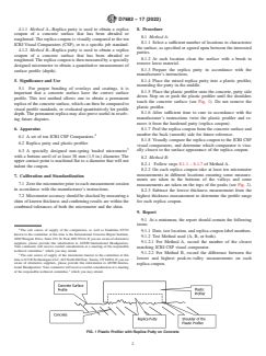 SIGNIFICANCE AND USE 5.1 For proper bonding of overlays and coatings, it is important that a concrete surface have the correct surface profile. This test method allows one to obtain a permanent replica of the concrete surface, which can then be compared to visual profile standards, or evaluated quantitatively for profile depth. The permanent replica may also prove useful in resolving future disputes. FIG. 1 Plastic Profiler with Replica Putty on Concrete SCOPE 1.1 This test method is suitable for both field and laboratory use to obtain a permanent record of concrete surface profile using replica putty and to determine the depth of that surface profile. Note 1: The procedure in this standard was developed for concrete substrates but may be appropriate for other rigid substrates. 1.2 A profile can be imparted to concrete by various methods such as blast cleaning and acid etching. The depth of the surface profile has been shown to be a factor in coating adhesion and performance. 1.3 The International Concrete Repair Institute (ICRI) provides a means of visually judging a concrete surface by use of ten different visual comparators called Concrete Surface Profiles (CSP). This standard compliments the use of these visual comparators. 1.4 The values stated in SI units are to be regarded as standard. The values given in parentheses are for information only. 1.5 This standard does not purport to address all of the safety concerns, if any, associated with its use. It is the responsibility of the user of this standard to establish appropriate safety, health, and environmental practices and determine the applicability of regulatory limitations prior to use. 1.6 This international standard was developed in accordance with internationally recognized principles on standardization established in the Decision on Principles for the Development of International Standards, Guides and Recommendations issued by the World Trade Organization Technical Barriers to Trade (TBT) Committee.