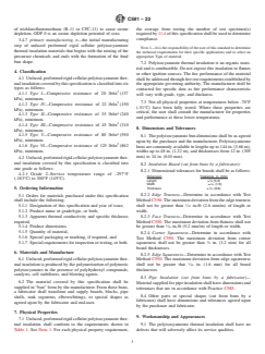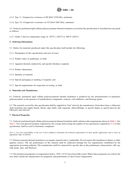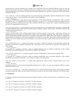ABSTRACT This specification covers the types, physical properties, and dimensions of unfaced, preformed rigid cellular polyurethane modified polyisocyanurate plastic material intended for use as thermal insulation on surfaces. This insulation can be classified into six types according to its compressive resistance: Types I, IV, II, III, V, and VI. Also this insulation can be classified as Grades 1 and 2 according to its service temperature range. The thermal insulation is produced by the polymerization of polymeric polyisocyanates in the presence of polyhydroxyl compounds, catalysts, cell stabilizers, and blowing agents. Different test methods shall be performed in order to determine the thermal insulation's following properties: density, compressive resistance, apparent thermal conductivity, hot-surface performance, water absorption, water vapor permeability, dimensional stability, closed-cell content, surface bearing characteristics, tensile strength, and leachable chloride, fluoride, silicate, and sodium ions. SCOPE 1.1 This specification covers the types, physical properties, and dimensions of unfaced, preformed rigid cellular polyisocyanurate plastic material intended for use as thermal insulation on surfaces from –297°F (–183°C) to 300°F (149°C). For specific applications, the actual temperature limits shall be agreed upon by the manufacturer and purchaser. 1.2 This specification only covers “polyurethane modified polyisocyanurate” thermal insulation which is commonly referred to as “polyisocyanurate” thermal insulation. This standard does not encompass all polyurethane modified materials. Polyurethane modified polyisocyanurate and other polyurethane materials are similar, but the materials will perform differently under some service conditions. 1.3 This standard is designed as a material specification, not a design document. Physical property requirements vary by application and temperature. At temperatures below –70°F (–51°C) the physical properties of the polyisocyanurate insulation at the service temperature are of particular importance. Below –70°F (–51°C) the manufacturer and the purchaser must agree on what additional cold temperature performance properties are required to determine if the material can function adequately for the particular application. 1.4 This standard addresses requirements of unfaced preformed rigid cellular polyisocyanurate thermal insulation manufactured using blowing agents with an ozone depletion potential of 0 (ODP 0). 1.5 Except 6.2 and 8.2 – 8.4, which are related to the size and shape of fabricated parts, and 16.1, which is related to the storage of fabricated parts, the requirements in this standard specification apply to the polyisocyanurate insulation in the form of buns supplied by the insulation manufacturer. 1.6 When adopted by an authority having jurisdiction, codes that address fire properties in many applications regulate the use of the thermal insulation materials covered by this specification. Fire properties are controlled by job, project, or other specifications where codes or government regulations do not apply. 1.7 The values stated in inch-pound units are to be regarded as standard. The values given in parentheses are mathematical conversions to SI units that are provided for information only and are not considered standard. 1.8 This standard does not purport to address all of the safety concerns, if any, associated with its use. It is the responsibility of the user of this standard to establish appropriate safety, health, and environmental practices and determine the applicability of regulatory limitations prior to use. 1.9 This international standard was developed in accordance with internationally recognized principles on standardization established in the Decision on Principles for the Development of International Standards, Guides and Recommendations issued by the World Trade Organization Technical Barriers to Trade (TBT) Committee.