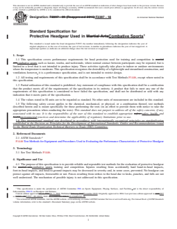 ASTM F2397-18 is a technical specification published by ASTM International. Its full title is "Standard Specification for Protective Headgear Used in Combative Sports". This standard covers: ABSTRACT This specification delas with the performance requirements for head protection used for training and competition in martial arts such as karate, wushu, and taekwondo, where normal contact between participants may be repeated, but is limited to a level that is not intended to produce injury. These activities typically take place in indoor or outdoor environments where the temperature is moderate. This specification recognizes the desirability of a lightweight and streamlined construction, and ventilation; however it is a performance specification, and is not intended to restrict design. Headgears shall be tested for the following and using the following test methods: reference marking, configuration, materials, projections, vision, retention test, stability or roll-off test, low-energy falling impact test, high-energy falling impact test, low-energy striking impact test, high-energy striking impact test, and high and low speed errors. The apparatus which shall be used are the test headforms, stability test instruments and equipment, falling impact test instruments and equipment, and striking impact instruments and equipment. The significance and use, conditioning environments, and test schedule are also detailed. SCOPE 1.1 This specification covers performance requirements for head protection used for training and competition in combative sports such as karate, wushu, and taekwondo, where normal contact between participants may be repeated, but is limited to a level that is not intended to produce injury. These activities typically take place in indoor or outdoor environments where the temperature is moderate. This specification recognizes the desirability of a lightweight and streamlined construction, and ventilation; however, it is a performance specification, and is not intended to restrict design. 1.2 All testing and requirements of this specification shall be in accordance with Test Methods F1446, except where noted in this specification. 1.3 Partial utilization of this standard is prohibited. Any statement of compliance with this specification shall be a certification that the product meets all of the requirements of the specification in its entirety. A product that fails to meet any one of the requirements of this specification is considered to have failed the specification, and shall not be distributed or sold with any indication that it meets parts of the specification. 1.4 The values stated in SI units are to be regarded as standard. No other units of measurement are included in this standard. 1.5 The following safety caveat applies to the chemical, mechanical, or physical, or a combination thereof, test methods described herein and is meant specifically for those performing the tests (in an effort to provide them with notice to take the appropriate precautions when conducting the tests): This standard does not purport to address all of the safety concerns, if any, associated with its use. It is the responsibility of the user of this standard to establish appropriate safety, health, and environmental practices and determine the applicability of regulatory limitations prior to use. 1.6 This international standard was developed in accordance with internationally recognized principles on standardization established in the Decision on Principles for the Development of International Standards, Guides and Recommendations issued by the World Trade Organization Technical Barriers to Trade (TBT) Committee.