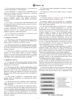SIGNIFICANCE AND USE 5.1 As part of the VE/VA study, perform function analysis after the collection of relevant information and prior to the identification of alternatives. 5.2 This practice provides a specific understanding of what must be accomplished and provides the basis for stimulating the creative phase of the value methodology. This is accomplished by naming and analyzing the functions and using the functions of the VE/VA study to generate ideas and alternative solutions. 5.3 This practice establishes a communication format through which all stakeholders can understand the project, product, or process. 5.4 This practice presents a method by which stakeholders’ needs and desires are compared to the cost to satisfy those needs and desires. 5.4.1 Function cost data help the user identify the alternatives and their functions that are highly valued with respect to their cost, thereby targeting opportunities for increasing value. 5.4.2 Targeting is done by identifying the low preference/high cost functions and high preference/low cost functions. These data will be used in the VE/VA study as a basis to create alternative solutions. 5.5 This practice helps stakeholders to formulate a strategy to maximize values. 5.6 Functions are also used to define criteria to compare alternatives. SCOPE 1.1 This practice covers a logical structure for the function analysis of a project, product, or process. 1.2 This practice provides a system to identify, define, and clearly communicate the purpose of a project, product, or process and the associated elements of the project, product, or process. 1.3 This practice covers the relationship between the functions that must be satisfied and the resources for a project, product, or process to accomplish those functions. 1.4 The values stated in SI units are to be regarded as standard. The values given in parentheses after SI units are provided for information only and are not considered standard. 1.5 This standard does not purport to address all of the safety concerns, if any, associated with its use. It is the responsibility of the user of this standard to establish appropriate safety, health, and environmental practices and determine the applicability of regulatory limitations prior to use. 1.6 This international standard was developed in accordance with internationally recognized principles on standardization established in the Decision on Principles for the Development of International Standards, Guides and Recommendations issued by the World Trade Organization Technical Barriers to Trade (TBT) Committee.