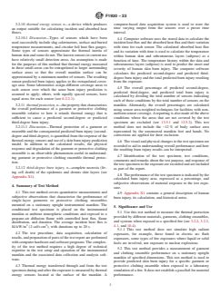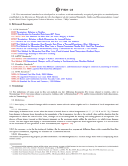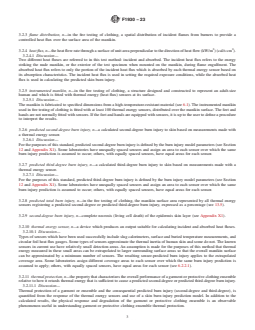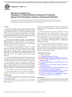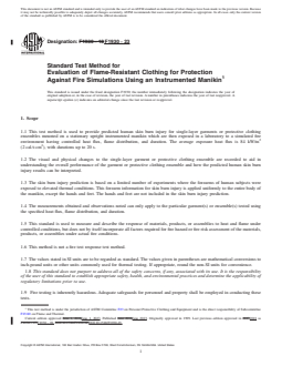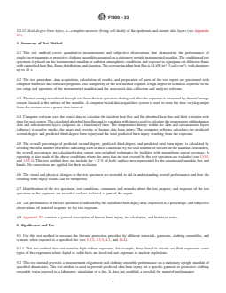 SIGNIFICANCE AND USE 5.1 Use this test method to measure the thermal protection provided by different materials, garments, clothing ensembles, and systems when exposed to a specified fire (see 3.2.2, 3.2.3, 4.1, and 10.4). 5.1.1 This test method does not simulate high radiant exposures, for example, those found in electric arc flash exposures, some types of fire exposures where liquid or solid fuels are involved, nor exposure to nuclear explosions. 5.2 This test method provides a measurement of garment and clothing ensemble performance on a stationary upright manikin of specified dimensions. This test method is used to provide predicted skin burn injury for a specific garment or protective clothing ensemble when exposed to a laboratory simulation of a fire. It does not establish a pass/fail for material performance. 5.2.1 This test method is not intended to be a quality assurance test. The results do not constitute a material’s performance specification. 5.2.2 The effects of body position and movement are not addressed in this test method. 5.3 The measurement of the thermal protection provided by clothing is complex and dependent on the apparatus and techniques used. It is not practical in a test method of this scope to establish details sufficient to cover all contingencies. Departures from the instructions in this test method have the potential to lead to significantly different test results. Technical knowledge concerning the theory of heat transfer and testing practices is needed to evaluate if, and which departures from the instructions given in this test method are significant. Standardization of the test method reduces, but does not eliminate, the need for such technical knowledge. Report any departures along with the results. SCOPE 1.1 This test method is used to provide predicted human skin burn injury for single-layer garments or protective clothing ensembles mounted on a stationary upright instrumented manikin which are then exposed in a laboratory to a simulated fire environment having controlled heat flux, flame distribution, and duration. The average exposure heat flux is 84 kW/m2 (2 cal/s·cm2), with durations up to 20 s. 1.2 The visual and physical changes to the single-layer garment or protective clothing ensemble are recorded to aid in understanding the overall performance of the garment or protective clothing ensemble and how the predicted human skin burn injury results can be interpreted. 1.3 The skin burn injury prediction is based on a limited number of experiments where the forearms of human subjects were exposed to elevated thermal conditions. This forearm information for skin burn injury is applied uniformly to the entire body of the manikin, except the hands and feet. The hands and feet are not included in the skin burn injury prediction. 1.4 The measurements obtained and observations noted can only apply to the particular garment(s) or ensemble(s) tested using the specified heat flux, flame distribution, and duration. 1.5 This standard is used to measure and describe the response of materials, products, or assemblies to heat and flame under controlled conditions, but does not by itself incorporate all factors required for fire hazard or fire risk assessment of the materials, products, or assemblies under actual fire conditions. 1.6 This method is not a fire test response test method. 1.7 The values stated in SI units are to be regarded as standard. The values given in parentheses are mathematical conversions to inch-pound units or other units commonly used for thermal testing. If appropriate, round the non-SI units for convenience. 1.8 This standard does not purport to address all of the safety concerns, if any, associated with its use. It is the responsibility of the user of this standard to establish appropriate safety, health, and environmental practices and determine the applicability of regulatory limitations prior to use. 1.9 Fire testing is ...