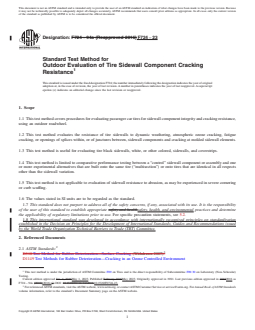 SIGNIFICANCE AND USE 4.1 Test Methods D1149 and D1171 can be used to evaluate different aspects of fatigue and weather cracking resistance of sidewall component materials in the form of test specimens. The present method applies to complete tires that are subjected to actual weather exposure conditions. The present method is satisfactory for research and development purposes but is not applicable to regulatory statutes or purchase specifications until standard classifications of state of cracking, similar to those in Test Method D1171, can be established. SCOPE 1.1 This test method covers procedures for evaluating passenger car tires for sidewall component integrity and cracking resistance, using an outdoor roadwheel. 1.2 This test method evaluates the resistance of tire sidewalls to dynamic weathering, atmospheric ozone cracking, fatigue cracking, or openings of splices within, or of junctures between, sidewall components and cracking at molded sidewall elements. 1.3 This test method is useful for evaluating tire black sidewalls, white, or other colored, sidewalls, and coverstrips. 1.4 This test method is limited to comparative performance testing between a “control” sidewall component or assembly and one or more experimental alternatives that are built onto the same tire (“multisection”) or onto tires that are identical in all respects other than the sidewall variation. 1.5 This test method is not applicable to evaluation of sidewall resistance to abrasion, as may be experienced in severe cornering or curb scuffing. 1.6 The values stated in SI units are to be regarded as the standard. 1.7 This standard does not purport to address all of the safety concerns, if any, associated with its use. It is the responsibility of the user of this standard to establish appropriate safety, health, and environmental practices and determine the applicability of regulatory limitations prior to use. For specific precaution statements, see 5.2. 1.8 This international standard was developed in accordance with internationally recognized principles on standardization established in the Decision on Principles for the Development of International Standards, Guides and Recommendations issued by the World Trade Organization Technical Barriers to Trade (TBT) Committee.