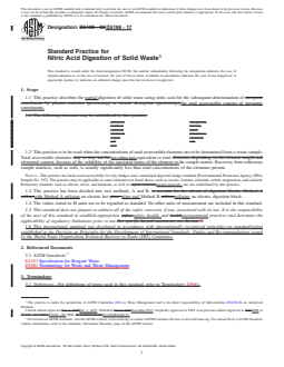 SIGNIFICANCE AND USE 5.1 A knowledge of the inorganic composition of a waste is often required for the selection of appropriate waste disposal practices. Solid waste may exist in a variety of forms and contain a range of organic and inorganic constituents. This practice describes a digestion procedure which dissolves many of the toxic inorganic constituents and produces a solution suitable for determination of total recoverable contents by such techniques as atomic absorption spectroscopy, atomic emission spectroscopy, and so forth. The relatively large sample size aids representative sampling of heterogenous wastes. The relatively small dilution factor allows lower detection limits than most other sample digestion methods. Volatile metals, such as lead and mercury, are not lost during this digestion procedure, however organo-lead and organo-mercury may not be completely digested. Hydride-forming elements, such as arsenic and selenium, may be partially lost. Samples with total metal contents greater than 5 % may give low results. The analyst is responsible for determining whether this practice is applicable to the solid waste being tested. SCOPE 1.1 This practice describes the partial digestion of solid waste using nitric acid for the subsequent determination of the total recoverable content of inorganic constituents. 1.2 This practice is to be used when the concentrations of total recoverable elements are to be determined from a waste sample. Total recoverable elements are often not equivalent to total elemental content, because of the solubility of the speciated forms of the element in the sample matrix. Recovery from refractory sample matrices, such as soils, is usually significantly less than total concentrations of the elements present. Note 1: This practice has been used successfully for oily sludges and a municipal digested sludge standard [Environmental Protection Agency (EPA) Sample No. 397]. The practice may be applicable to some elements not listed above, such as arsenic, barium, selenium, cobalt, magnesium, and calcium. Refractory elements such as silicon, silver, and titanium, as well as organo-mercury, are not solubilized by this practice. 1.3 This practice has been divided into two methods, A and B, with Method A utilizing an electric hot plate and Method B utilizing an electric digestion block. 1.4 The values stated in SI units are to be regarded as standard. No other units of measurement are included in this standard. 1.5 This standard does not purport to address all of the safety concerns, if any, associated with its use. It is the responsibility of the user of this standard to establish appropriate safety, health, and environmental practices and determine the applicability of regulatory limitations prior to use. 1.6 This international standard was developed in accordance with internationally recognized principles on standardization established in the Decision on Principles for the Development of International Standards, Guides and Recommendations issued by the World Trade Organization Technical Barriers to Trade (TBT) Committee.