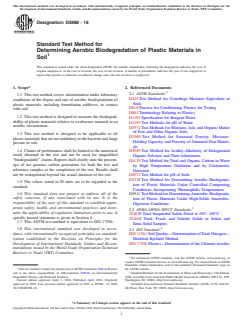 ASTM D5988-18 is a standard published by ASTM International. Its full title is "Standard Test Method for Determining Aerobic Biodegradation of Plastic Materials in Soil". This standard covers: SIGNIFICANCE AND USE 5.1 The degree and rate of aerobic biodegradability of a plastic material in the environment determines the extent to which and time period over which plastic materials are mineralized by soil microorganisms. Disposal is becoming a major issue with the increasing use of plastics, and the results of this test method permit an estimation of the degree of biodegradability and the time period over which plastics will remain in an aerobic soil environment. This test method determines the degree of aerobic biodegradation by measuring evolved carbon dioxide as a function of time that the plastic is exposed to soil. 5.2 Soil is an extremely species-rich source of inoculum for evaluation of the biodegradability of plastics in the environment. When maintained appropriately with regard to moisture content and oxygen availability, the biological activity is quite considerable, although lower than other biologically active environments, such as activated sewage-sludge or compost. SCOPE 1.1 This test method covers determination under laboratory conditions of the degree and rate of aerobic biodegradation of plastic materials, including formulation additives, in contact with soil. 1.2 This test method is designed to measure the biodegradability of plastic materials relative to a reference material in an aerobic environment. 1.3 This test method is designed to be applicable to all plastic materials that are not inhibitory to the bacteria and fungi present in soil. 1.4 Claims of performance shall be limited to the numerical result obtained in the test and not be used for unqualified “biodegradable” claims. Reports shall clearly state the percentage of net gaseous carbon generation for both the test and reference samples at the completion of the test. Results shall not be extrapolated beyond the actual duration of the test. 1.5 The values stated in SI units are to be regarded as the standard. 1.6 This standard does not purport to address all of the safety concerns, if any, associated with its use. It is the responsibility of the user of this standard to establish appropriate safety, health, and environmental practices and determine the applicability of regulatory limitations prior to use. A specific hazard statement is given in Section 8. 1.7 This ASTM test method is equivalent to ISO 17556. 1.8 This international standard was developed in accordance with internationally recognized principles on standardization established in the Decision on Principles for the Development of International Standards, Guides and Recommendations issued by the World Trade Organization Technical Barriers to Trade (TBT) Committee.